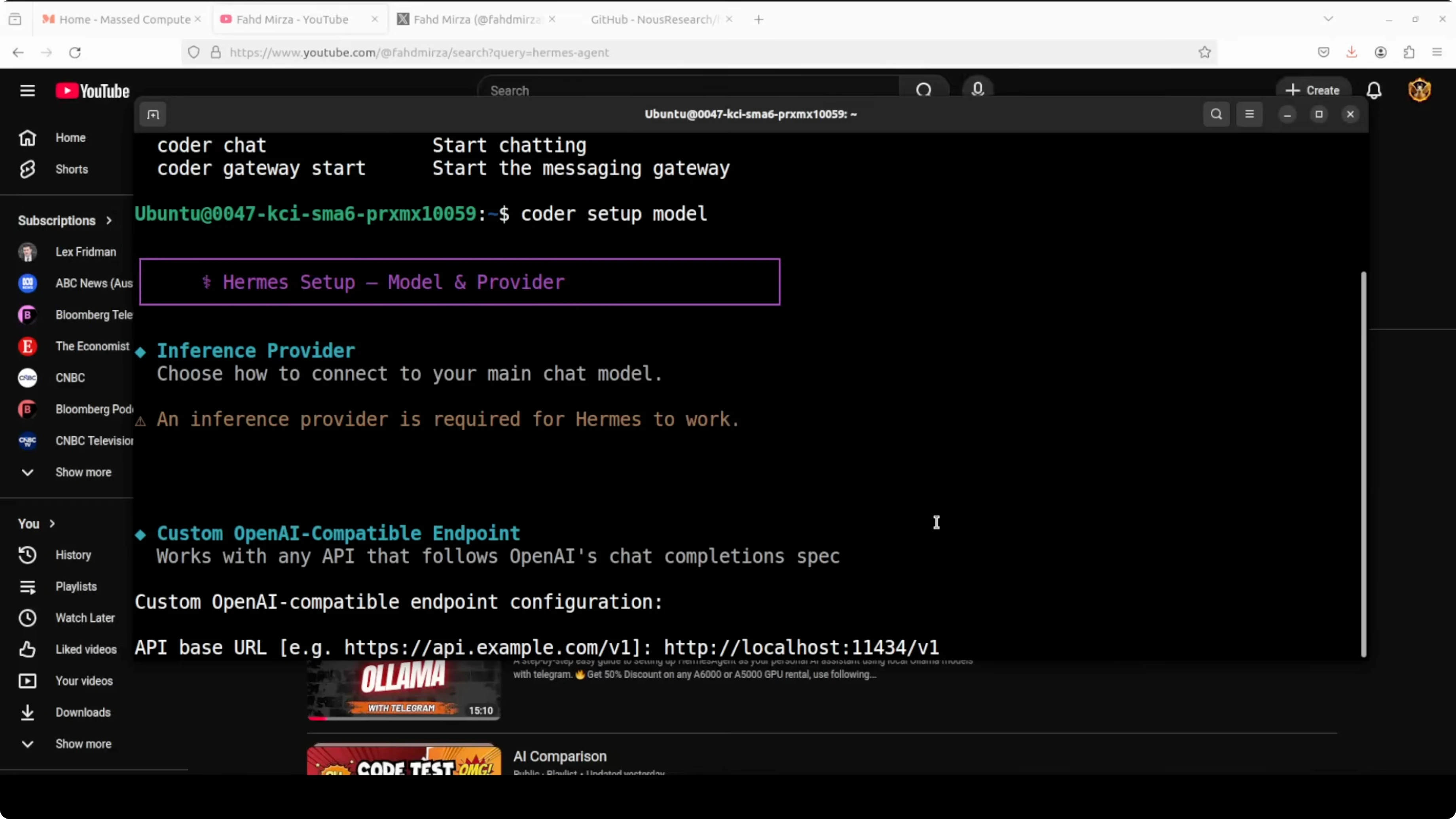 hermes profile create coderDuring setup, select a Custom - OpenAI compatible provider. Set the endpoint to your local Ollama server with the v1 suffix for compatibility.