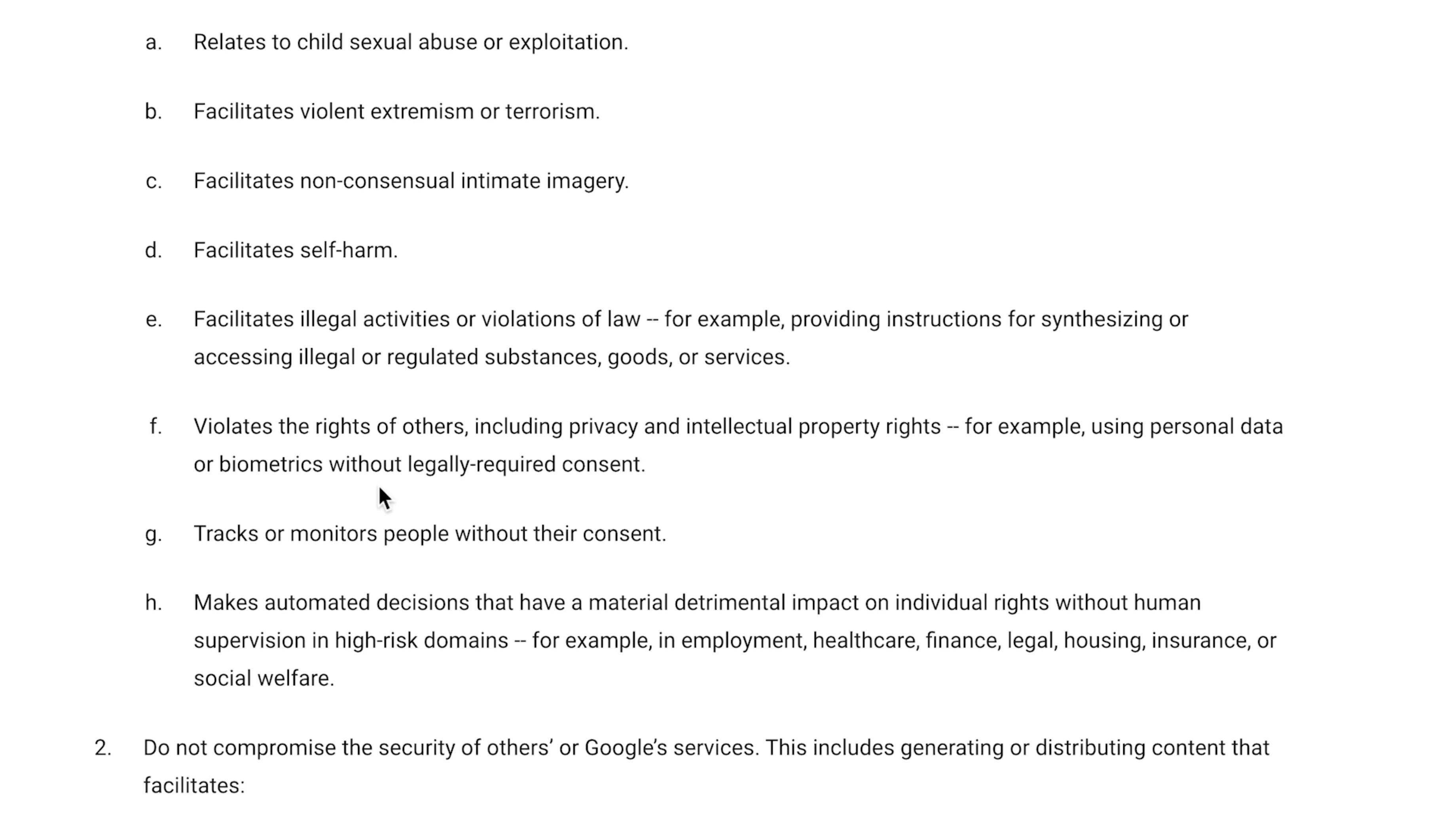 - Dangerous or illegal activities or anything that violates laws or regulations.