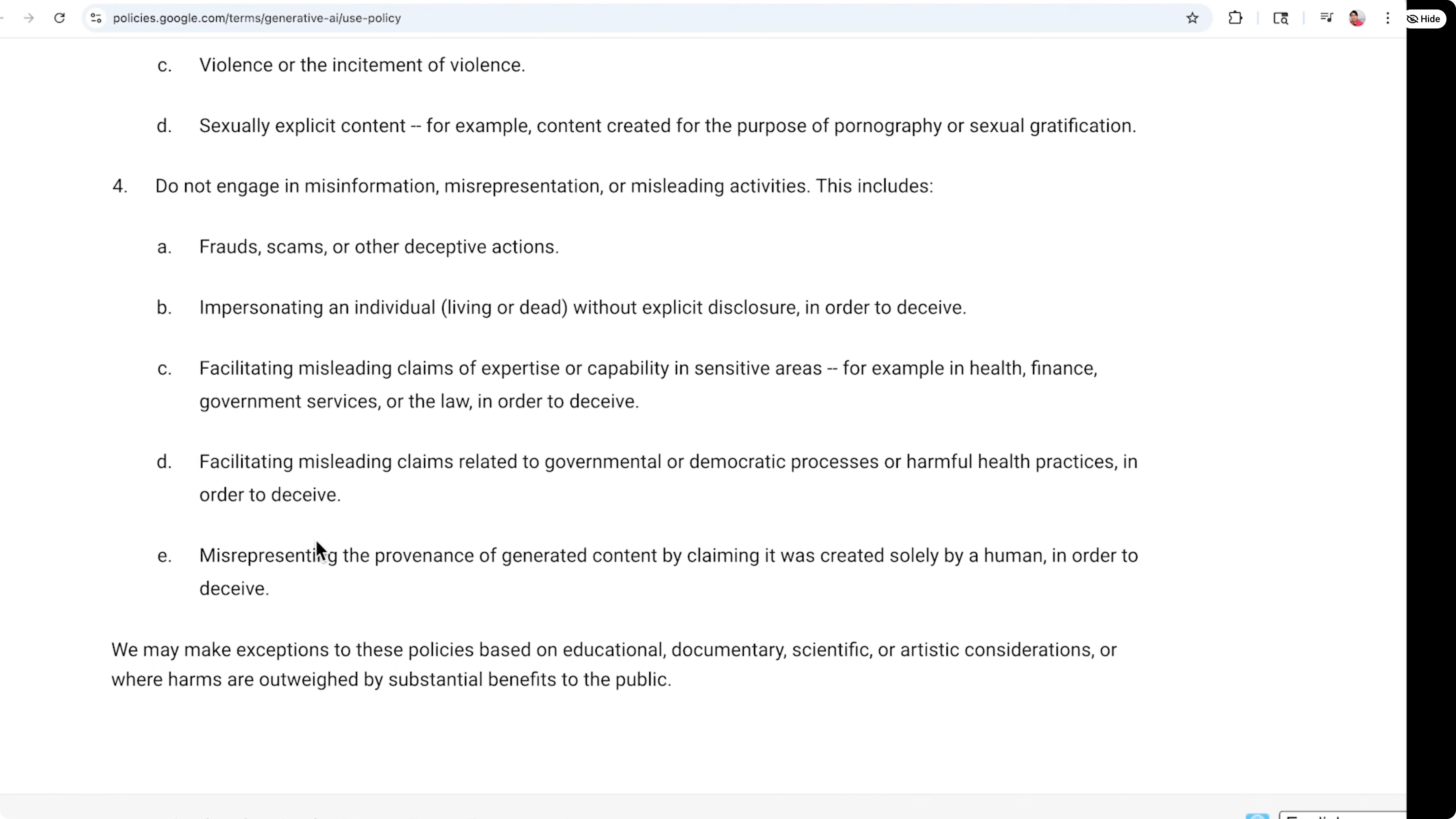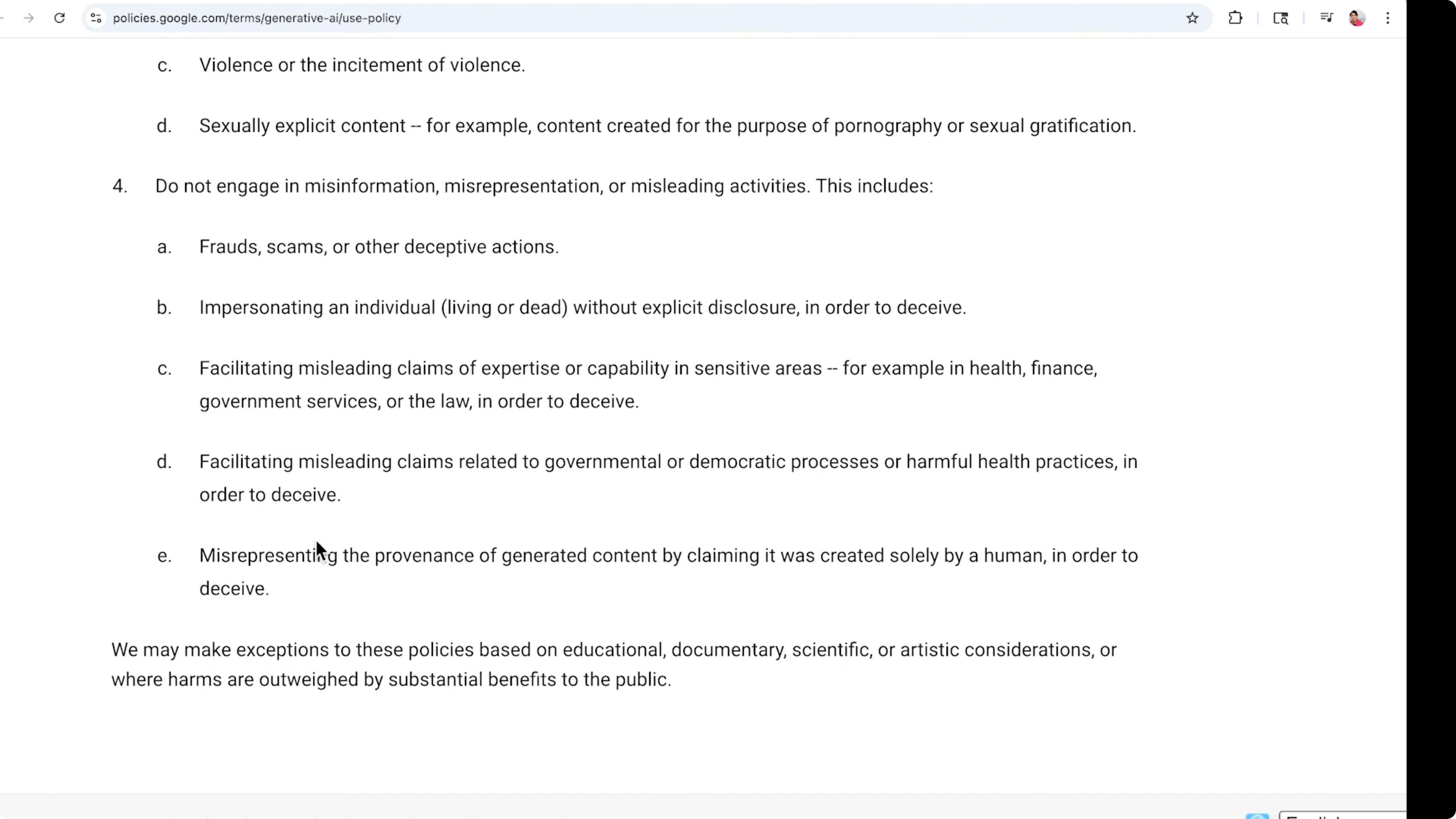 - Fraud, scams, or other deceptive actions.