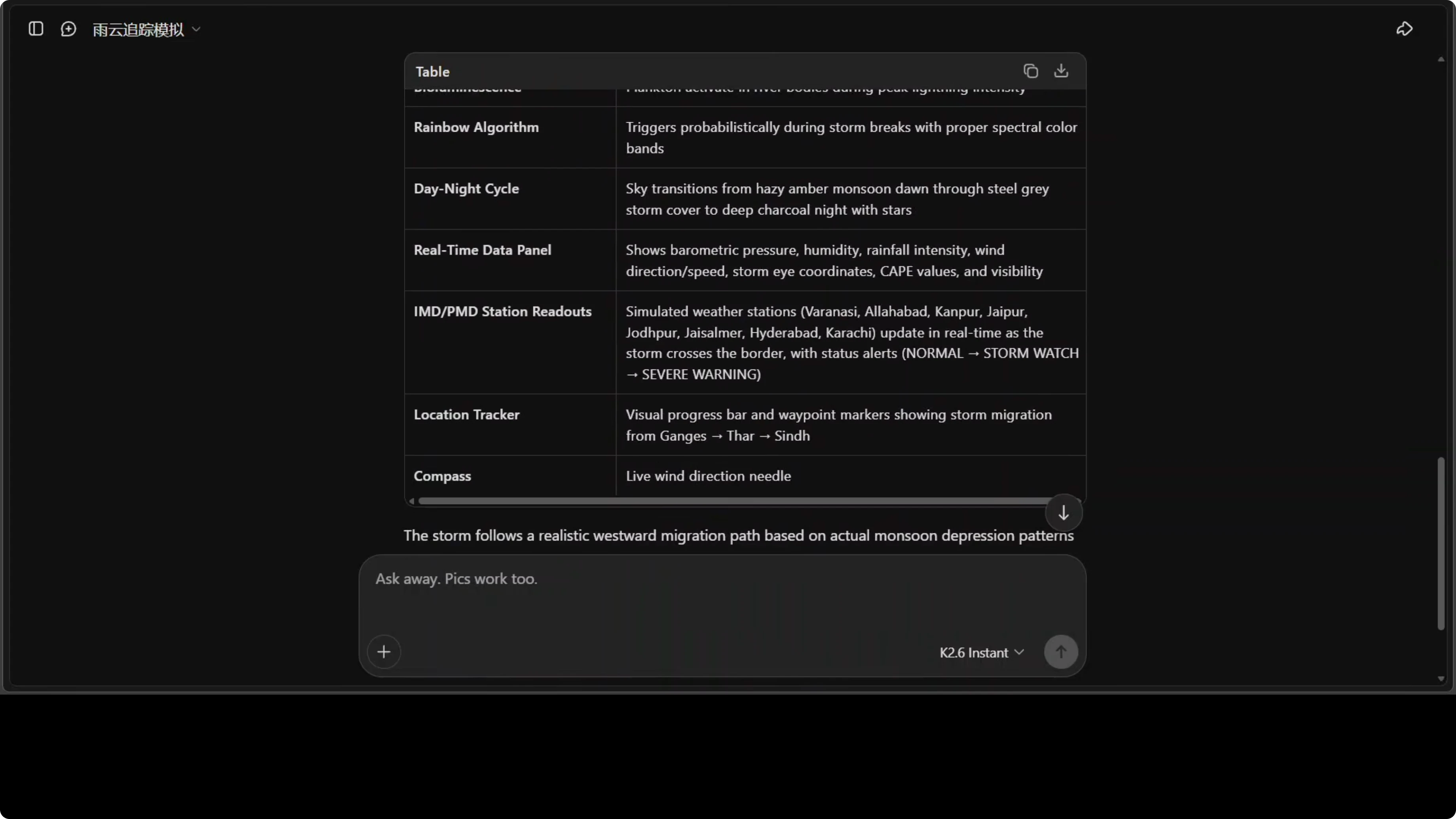 Open Kimi and select instant mode. Paste the prompt asking for a real-time monsoon supercell simulation that tracks from the Ganges plain across Rajasthan into Sindh, intensifies over water, and outputs a single self-contained HTML file. Ask for labeled UI panels with atmospheric metrics, a visible time-of-day cycle, dynamic visuals for wind, terrain changes, and lightning, and no external assets or build steps.