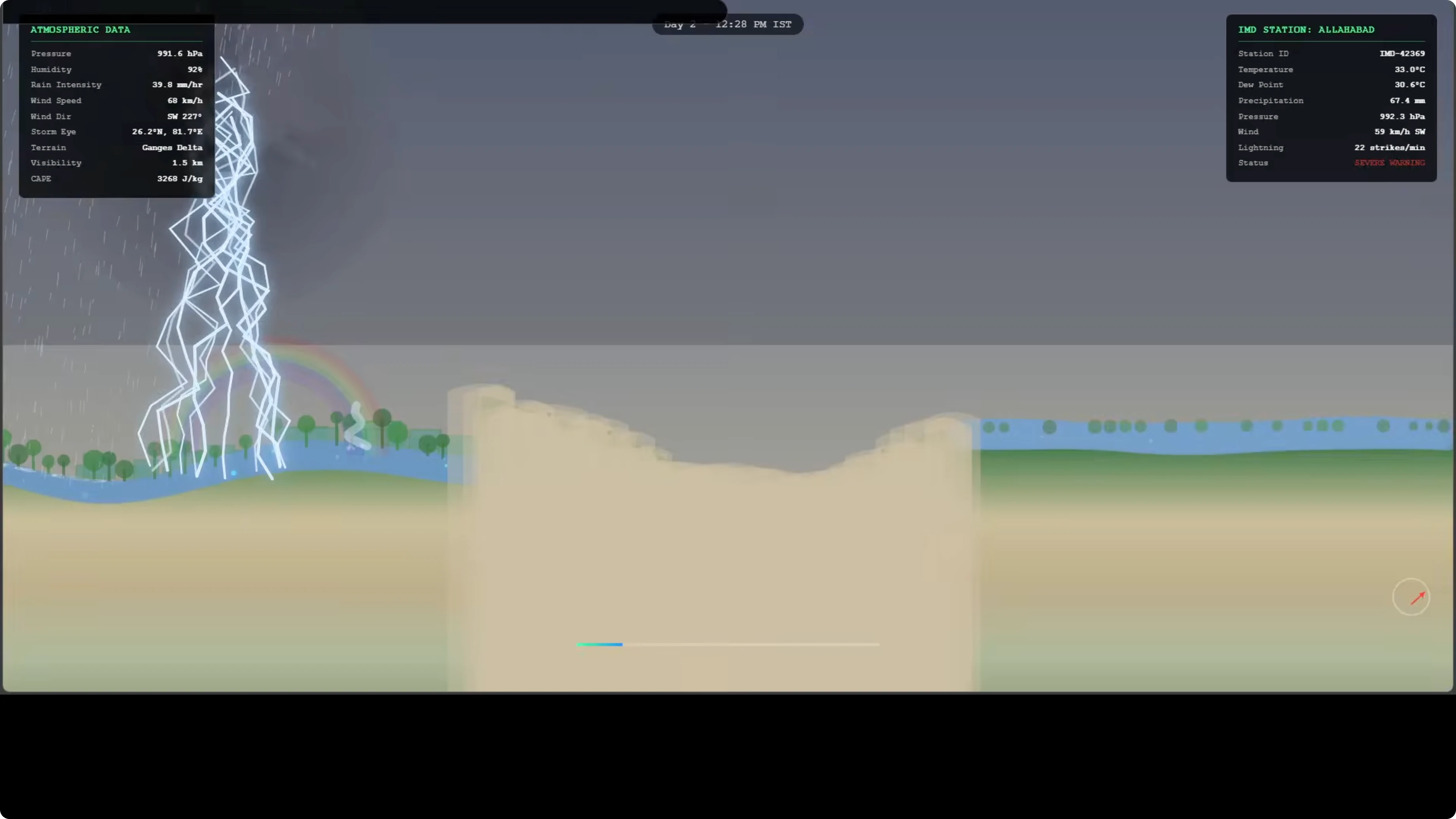 Kimi generated the entire storm system as a single HTML file with no external dependencies. In the browser the simulation runs with atmospheric data on the left and a labeled IMD station in Varanasi on the right. The storm moves across India into Pakistan, with zones, day and night transitions, rainbows, changing terrain, wind-blown trees, and vivid lightning.