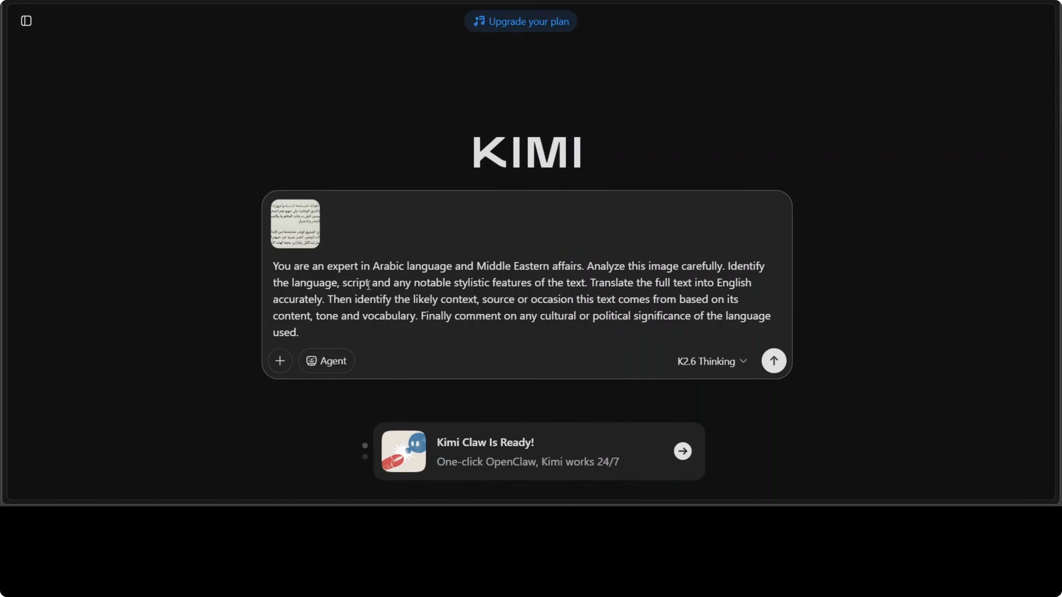 I provided an Arabic page and asked Kimi to identify the language and likely context, translate it, and analyze tone and rhetorical structure. The model identified Arabic abjad script, produced a full translation, and discussed the tone and shape of the argument. It inferred the broader political and cultural layers in the text and even found the source as a tweet.