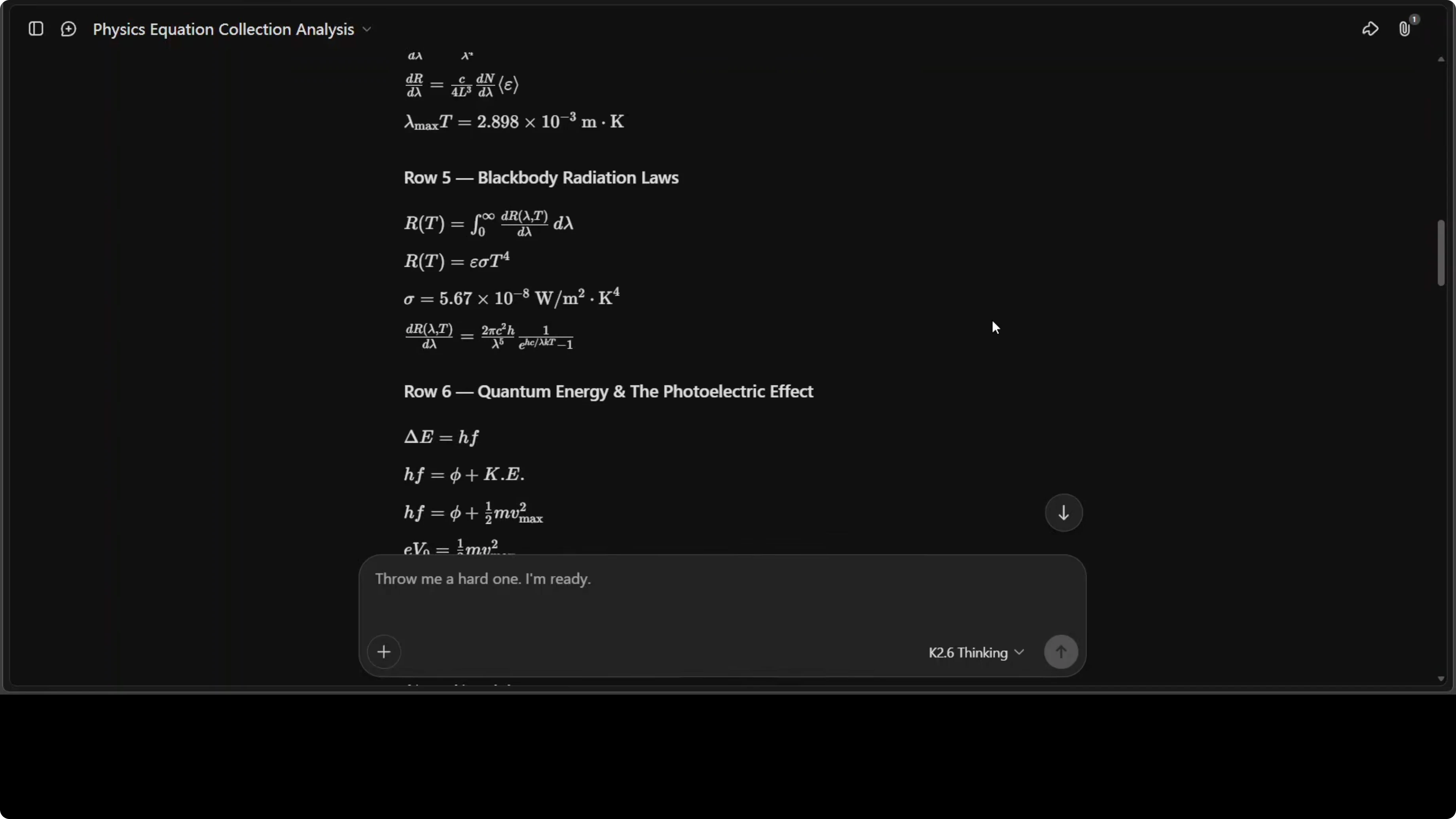 It transcribed all 28 equations accurately. It explained the historical significance of each entry and tied them together in a thematic analysis connecting special relativity and old quantum theory through wave particle duality. It correctly highlighted the ultraviolet catastrophe, Einstein’s Nobel winning work, and diagnosed the sheet as material from a sophomore undergraduate modern physics course.