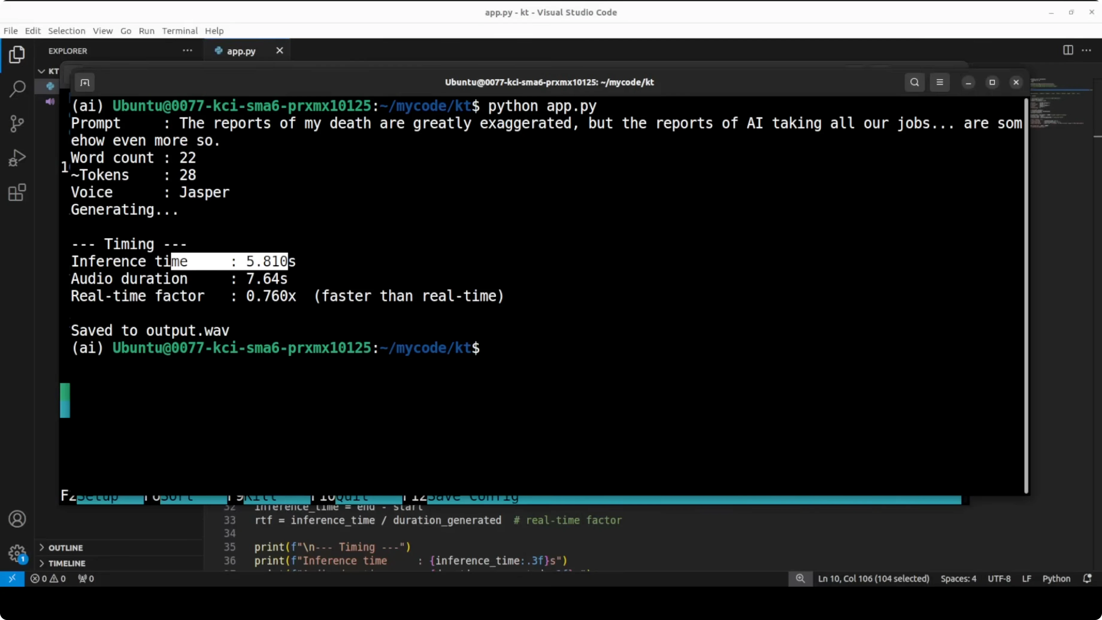 Everything finished, and the time it took was quite good. The real-time factor was also impressive. The prompt had 23 words, roughly around 29 tokens, and the model spent about 8.5 seconds with an RTF that indicated the model finished generating before the audio would even finish playing.