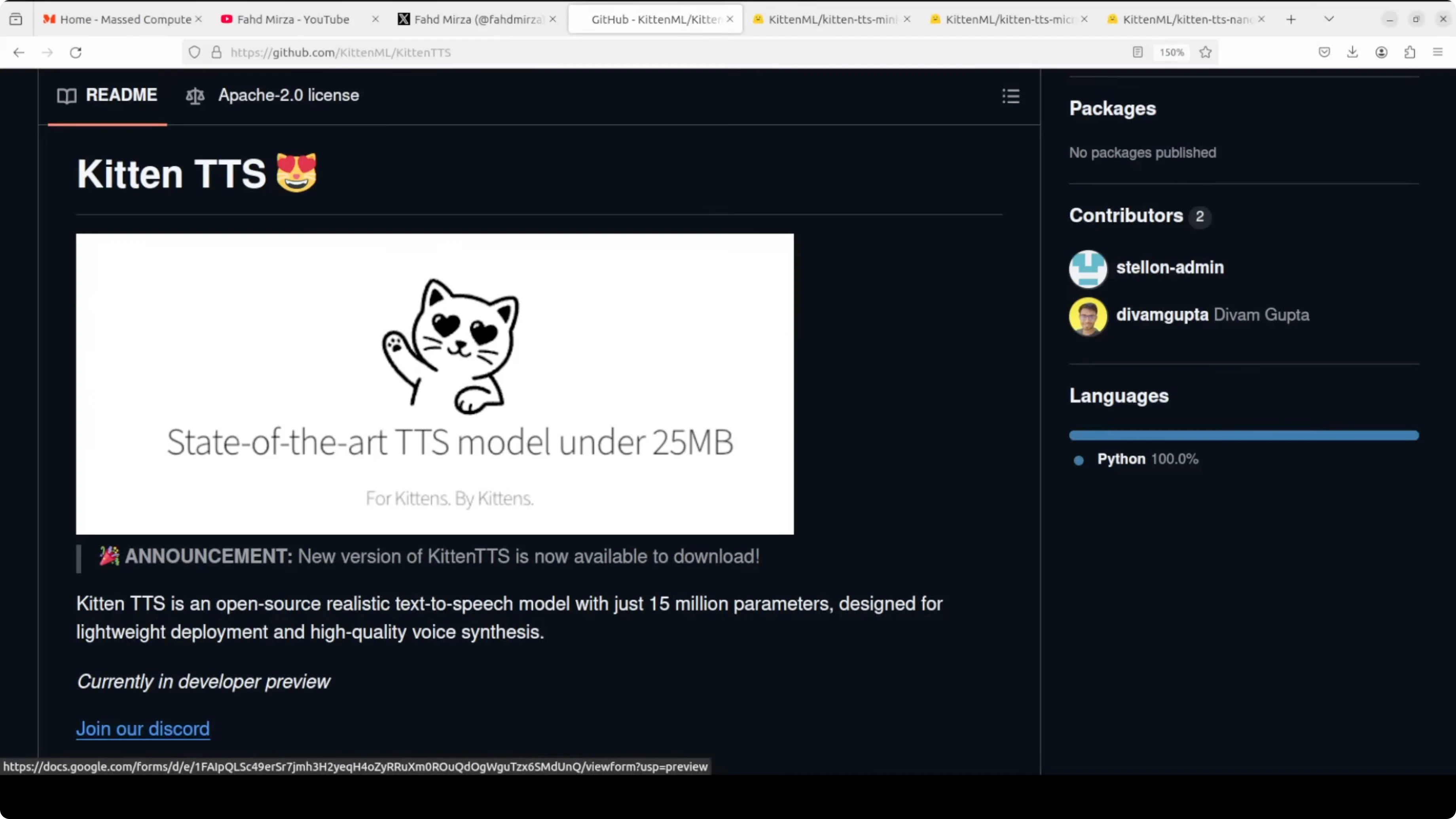 pip install "git+https://github.com/KittenML/KittenTTS"- Repo for reference: KittenTTS on GitHub.