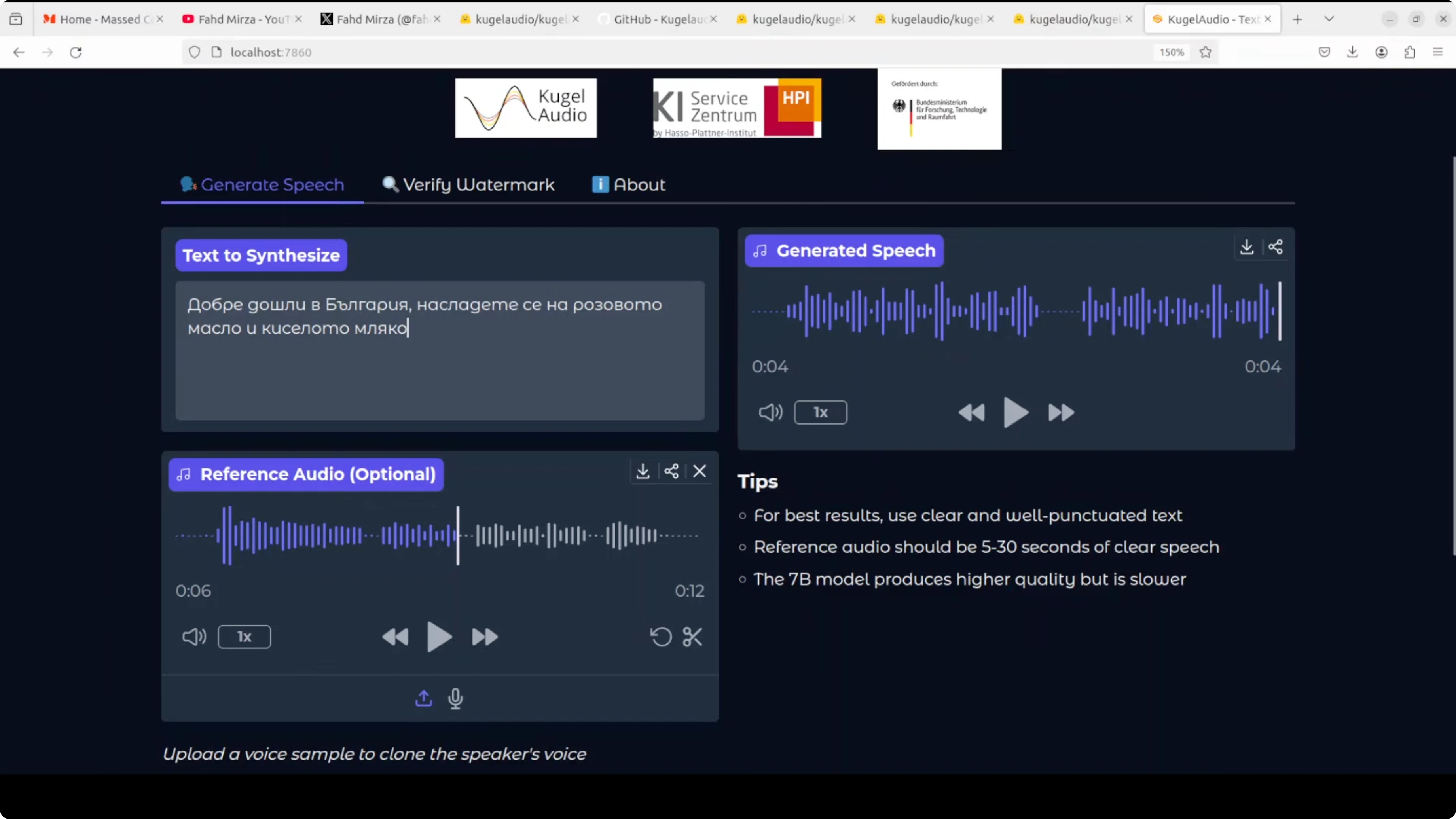 I generated Bulgarian on a short text about rose oil and yogurt using my own voice as the reference. Even though the reference audio quality was not great, it did quite a good job. The claim that it is at par or even better than ElevenLabs does not seem far-fetched to me, but I will let you be the judge.
