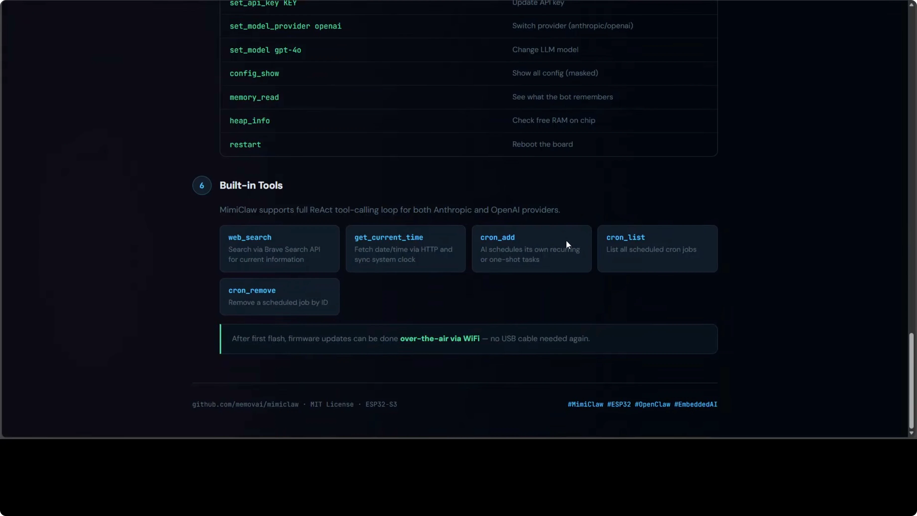The entire AI agent loop runs on the chip with no OS underneath it. LLM calls, tool use, memory, heartbeat, and cron all execute on-device using the ESP-IDF embedded framework. It supports both Anthropic Claude and OpenAI ChatGPT, switchable at runtime, and has no local models. For model context, see Claude Opus.