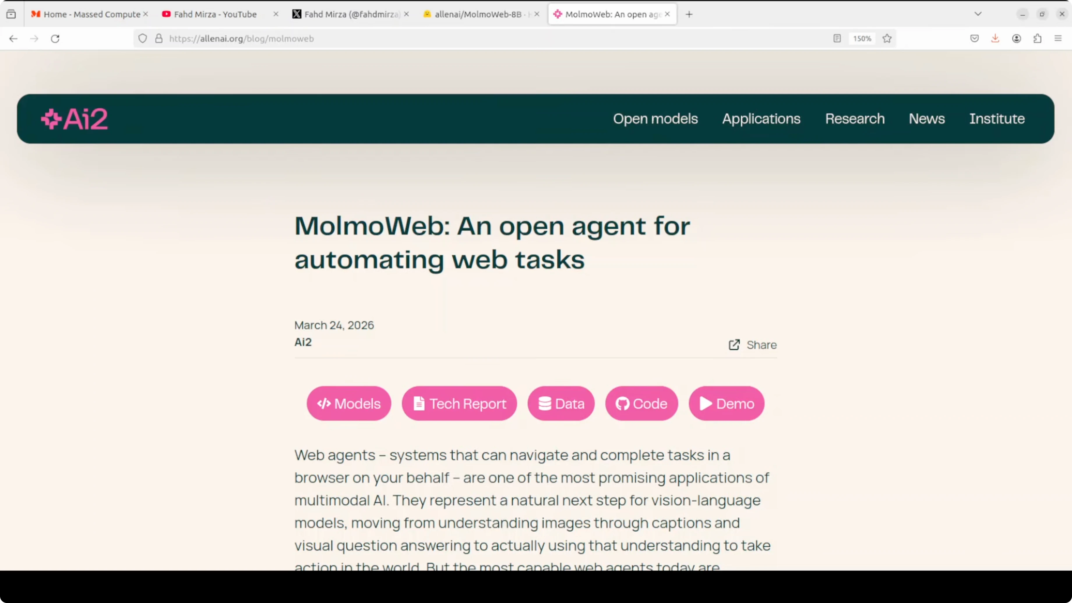 MolmoWeb is an open-source visual web agent from the Allen Institute for AI (AI2). Given a plain English instruction, it controls a real web browser autonomously. It works from screenshots, decides actions like click, type, scroll, and navigate, executes them, takes another screenshot, and repeats until the task is done.
