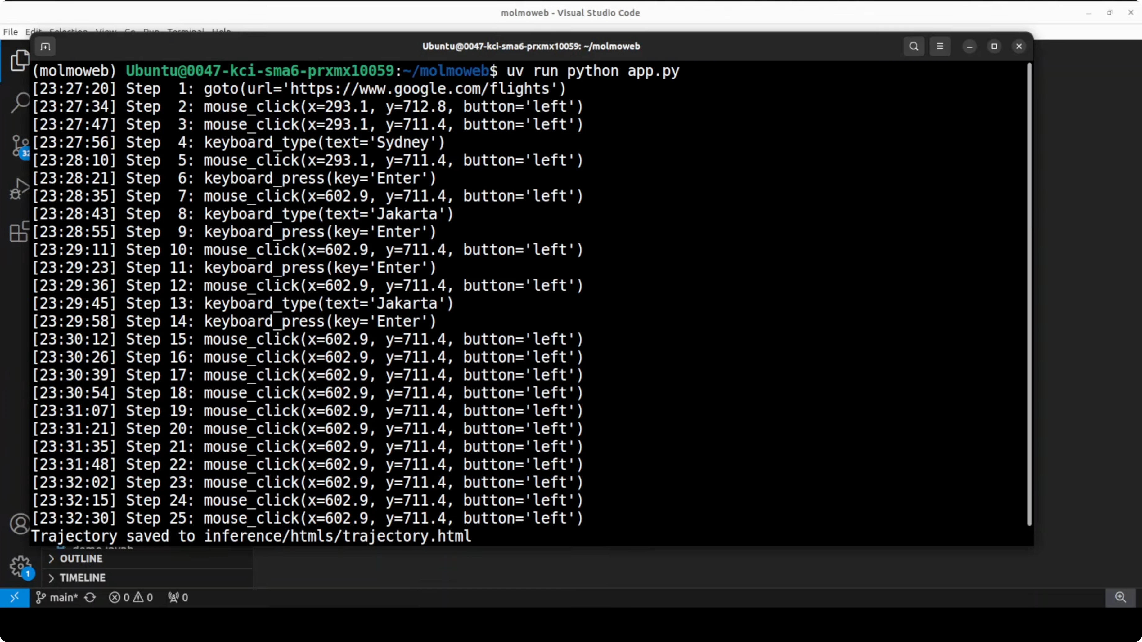 MolmoWeb writes a detailed HTML trajectory log for each run. The replay includes the screenshot at each step, the thought it generated, and the action it took. You can open the HTML file in a browser to review the full sequence end to end.