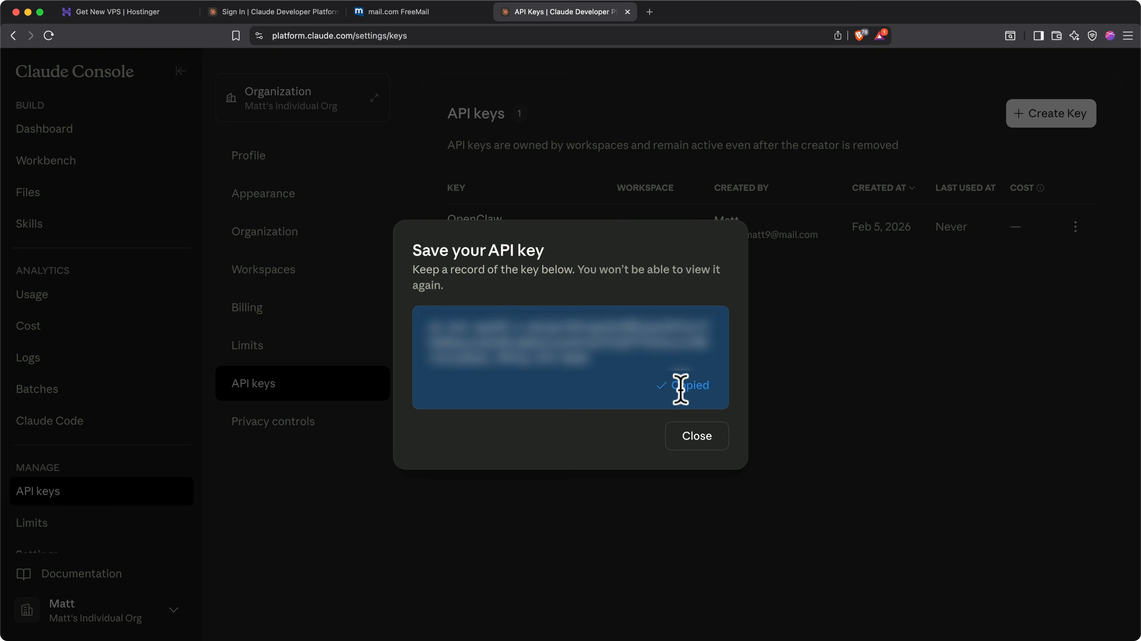 - Give your key a name. I'll call mine OpenClaw.