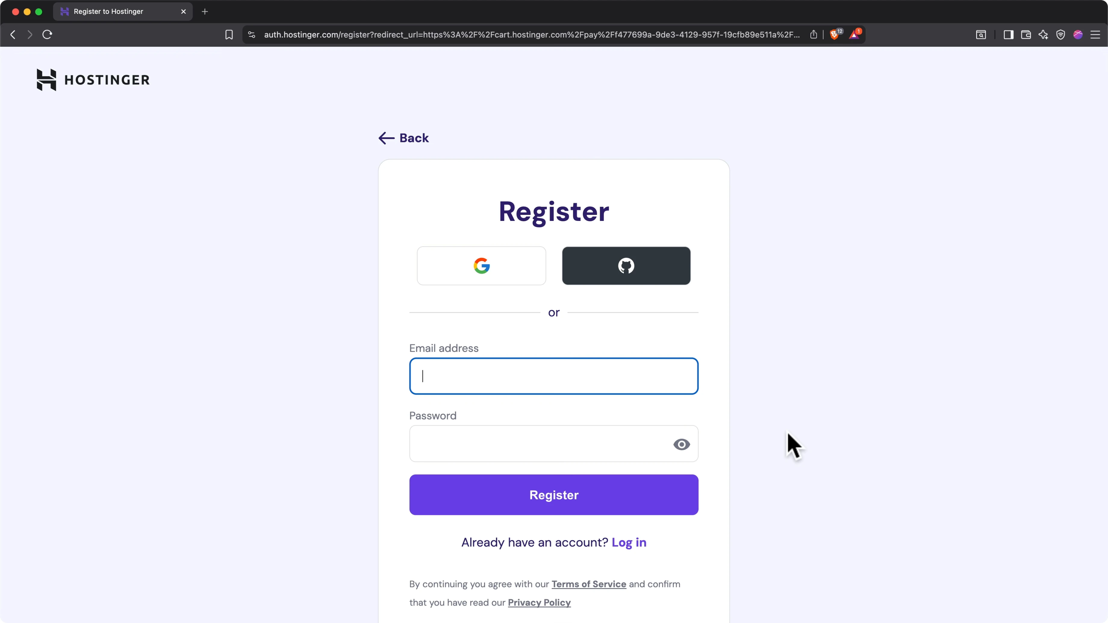 When you're ready, click continue. Register your hosting account with either Google or an email address, then enter your billing address and payment information to complete the transaction.