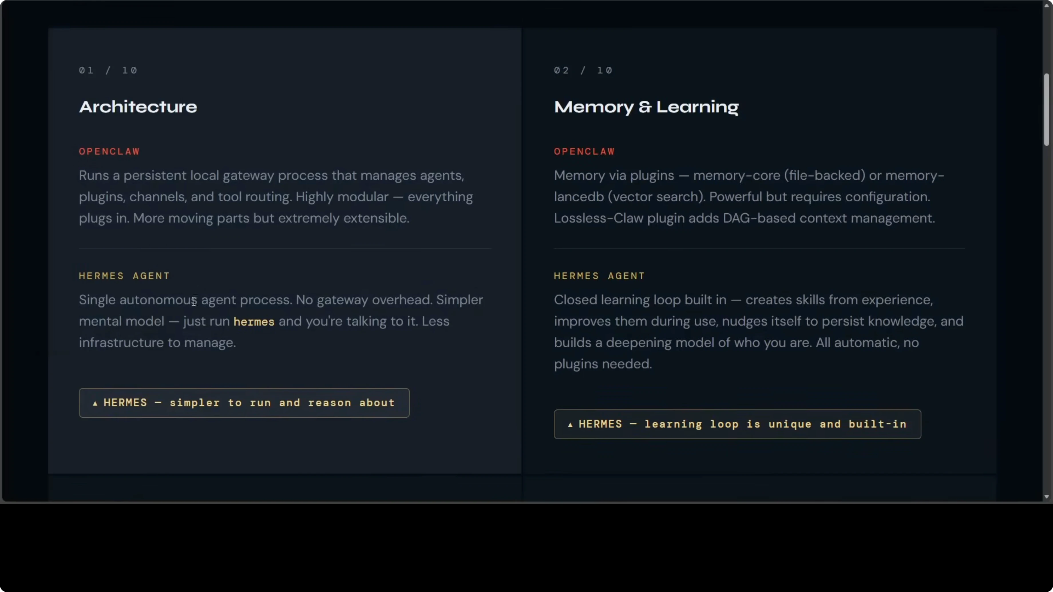 | Architecture | Persistent gateway with modular plugins, channels, and tool routing | Single process, type hermes and you are talking to it | Hermes |