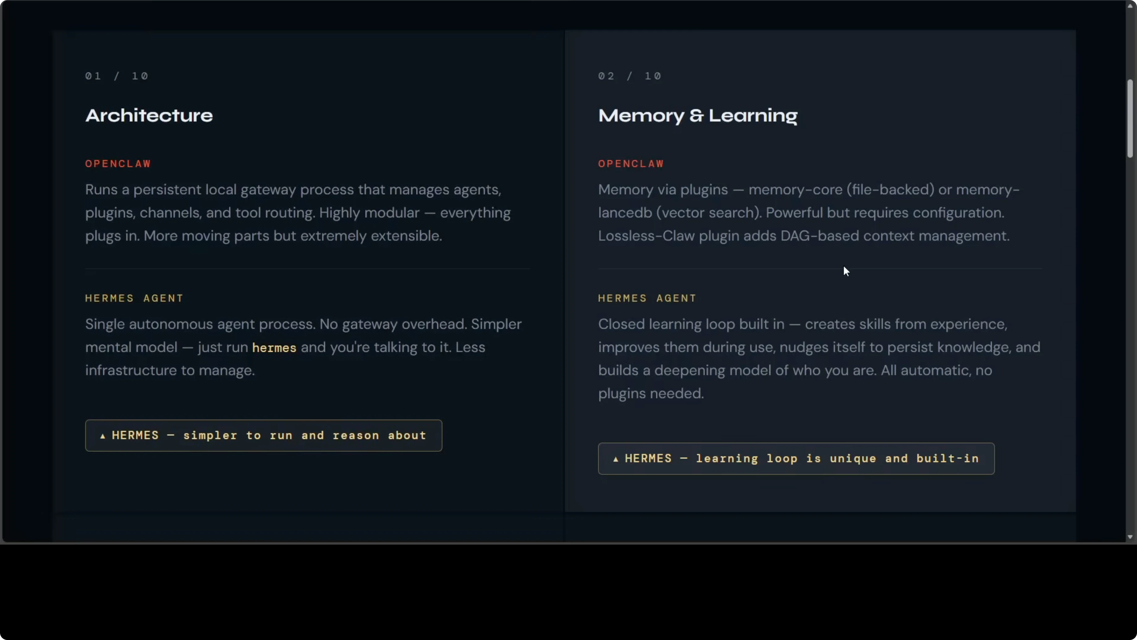 | Memory and learning | Plugin-based memory plus LosslessClaw context engine if added | Built-in learning loop, auto skill creation, auto memory saving | Hermes |