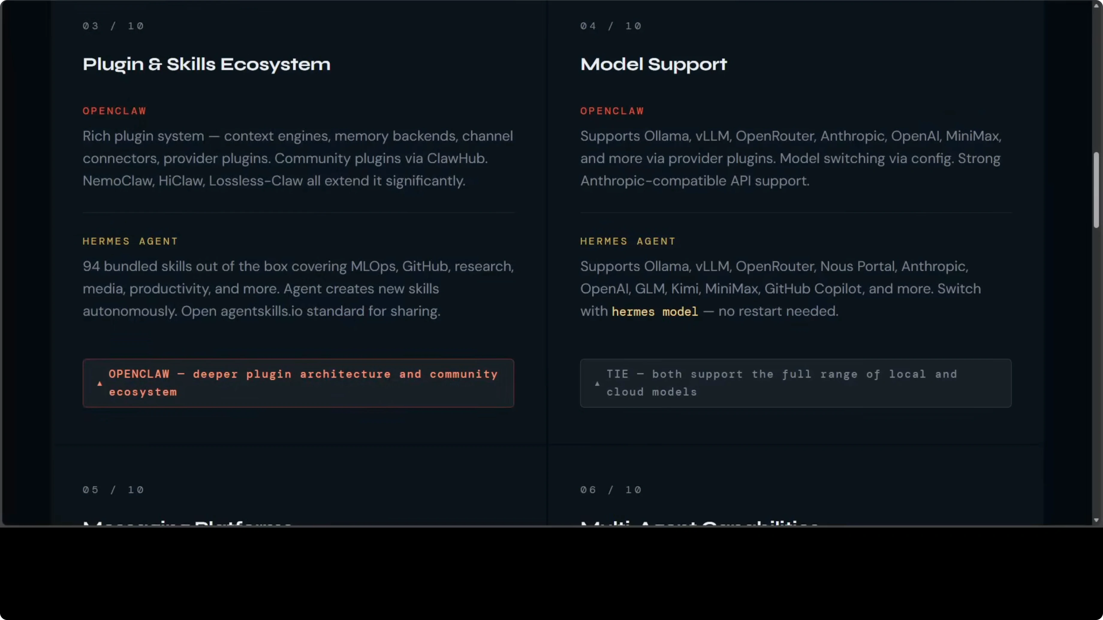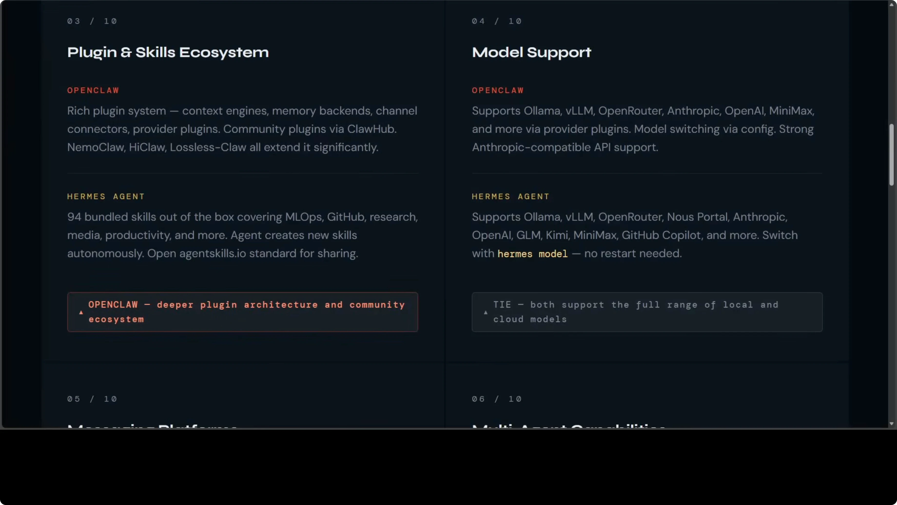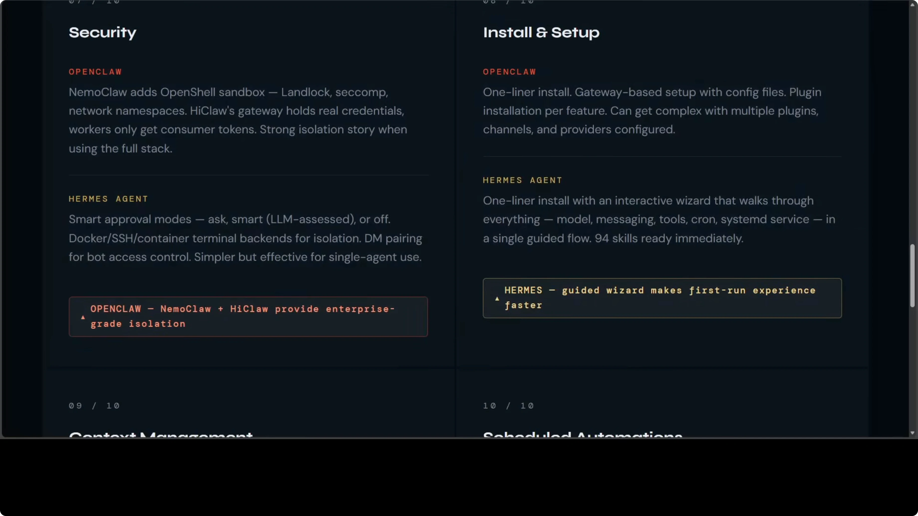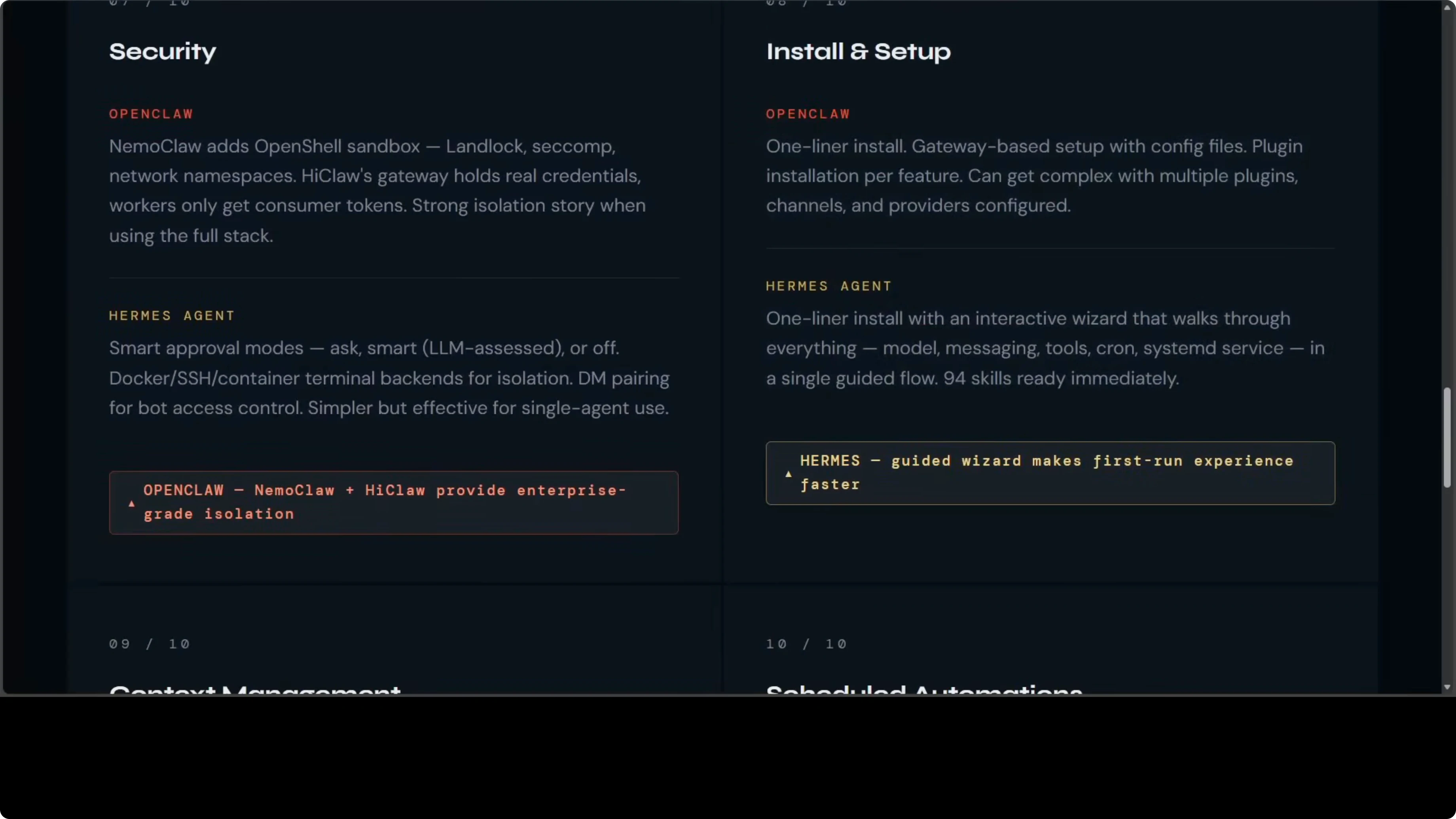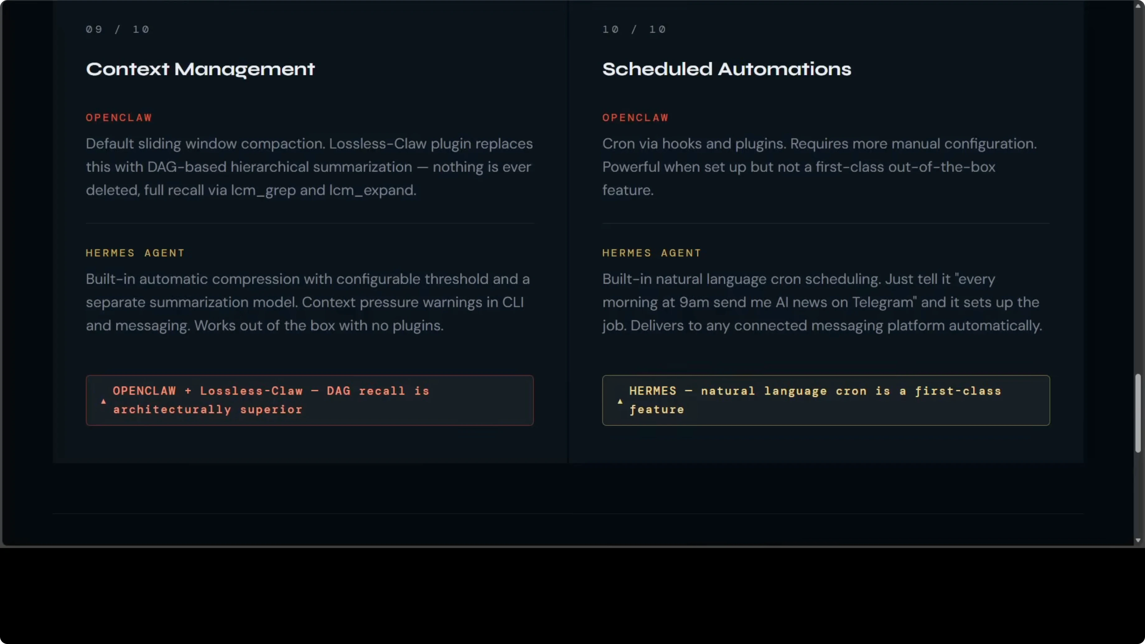 LosslessClaw brings DAG based hierarchical summarization to OpenClaw. Nothing is ever deleted, every message lives in SQLite, and depth zero summaries capture extractions and decisions, which is the most sophisticated context system I have seen in an open-source agent. Hermes has built-in automatic compression with a configurable threshold and a separate summarization model, and it shows context pressure warnings in the CLI.