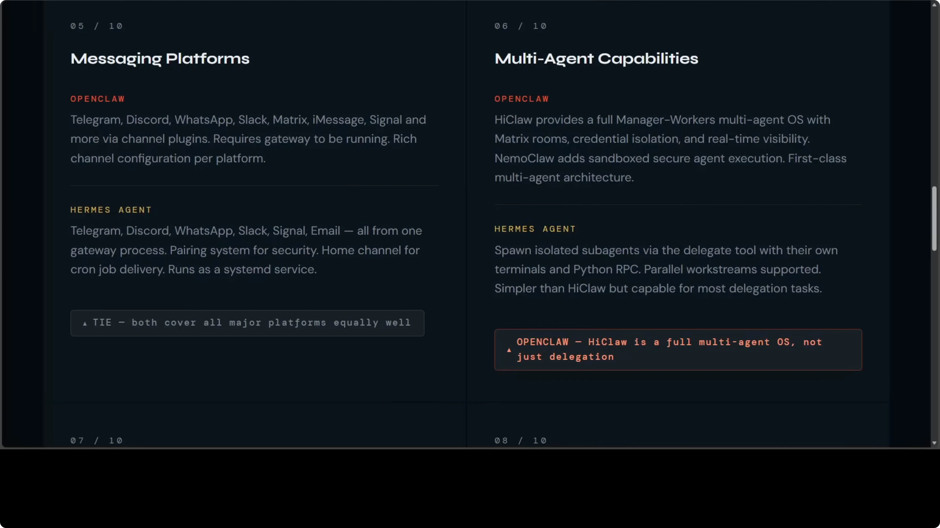 | Messaging platforms | Telegram, WhatsApp, Slack, Signal, Matrix, systemd services | Telegram, WhatsApp, Slack, Signal, Matrix, systemd services | Tie |