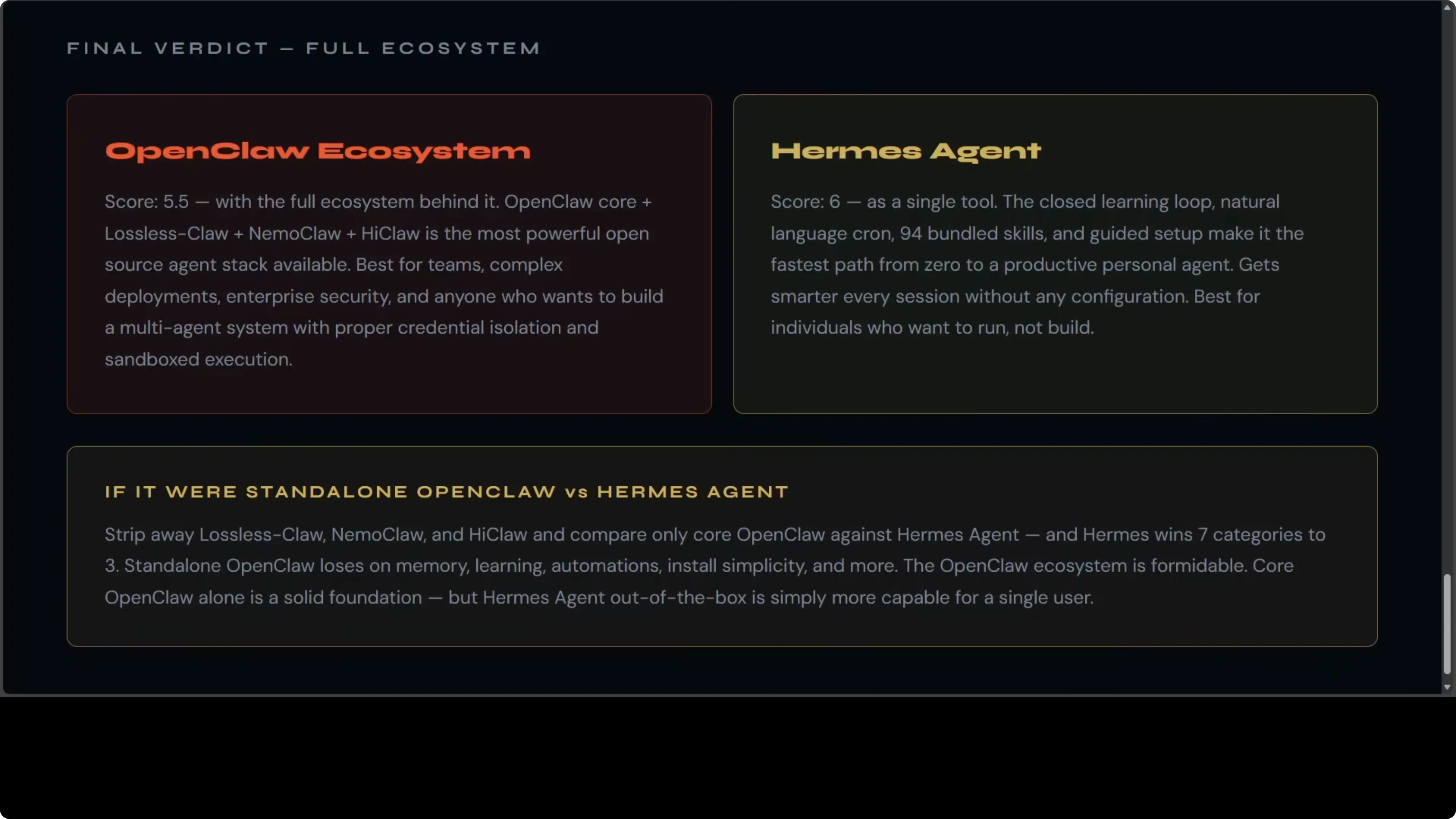 | Core-only note | Strip extras and compare core OpenClaw vs Hermes | Hermes wins 7 to 3 | Hermes |