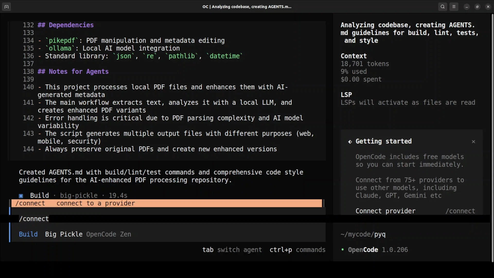 opencode.json, pick a suitable model with a large context window and tool use support, and connect. - Use Plan vs Build modes, the command palette, and codebase-aware features to describe, review, and modify files.