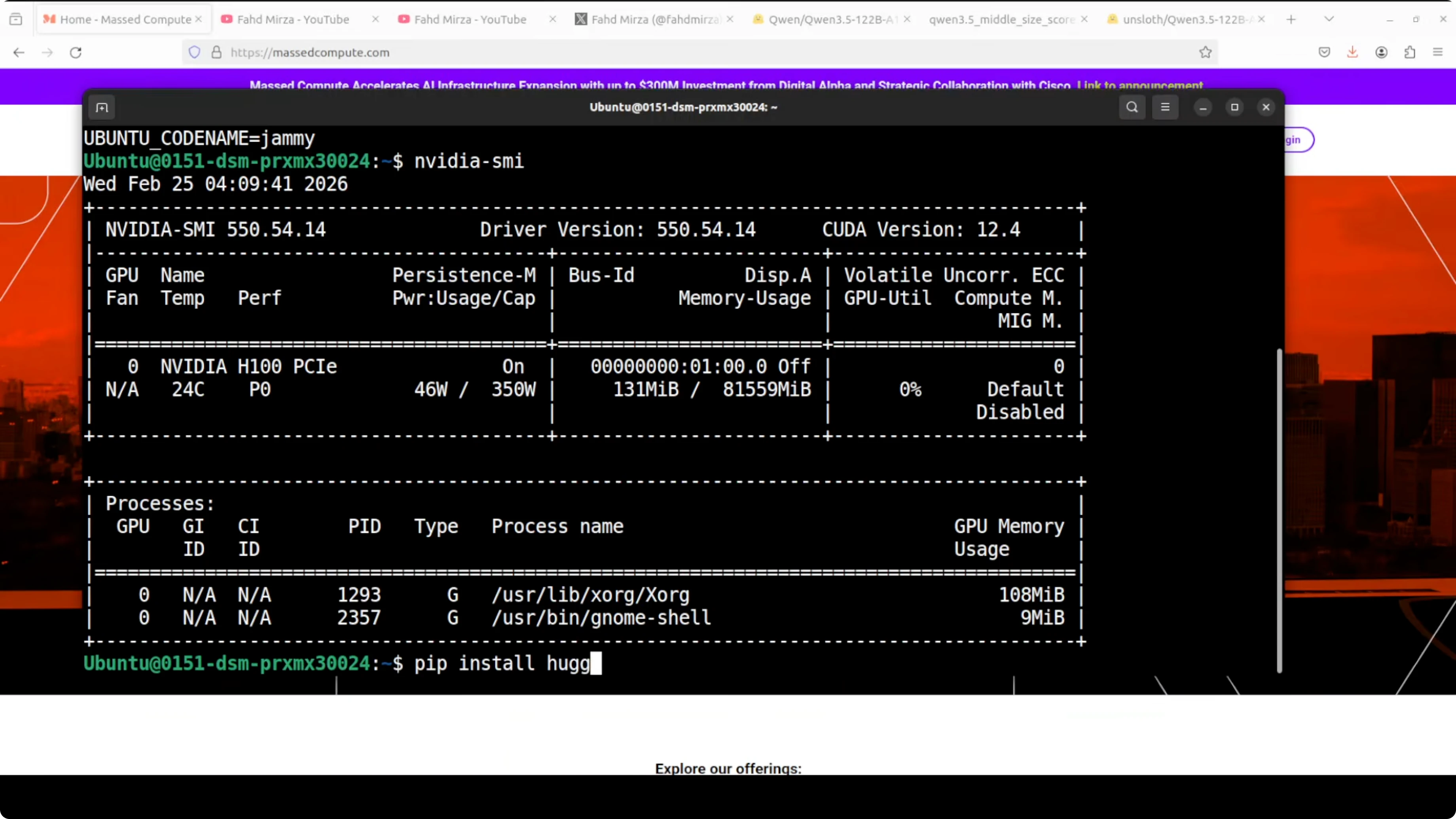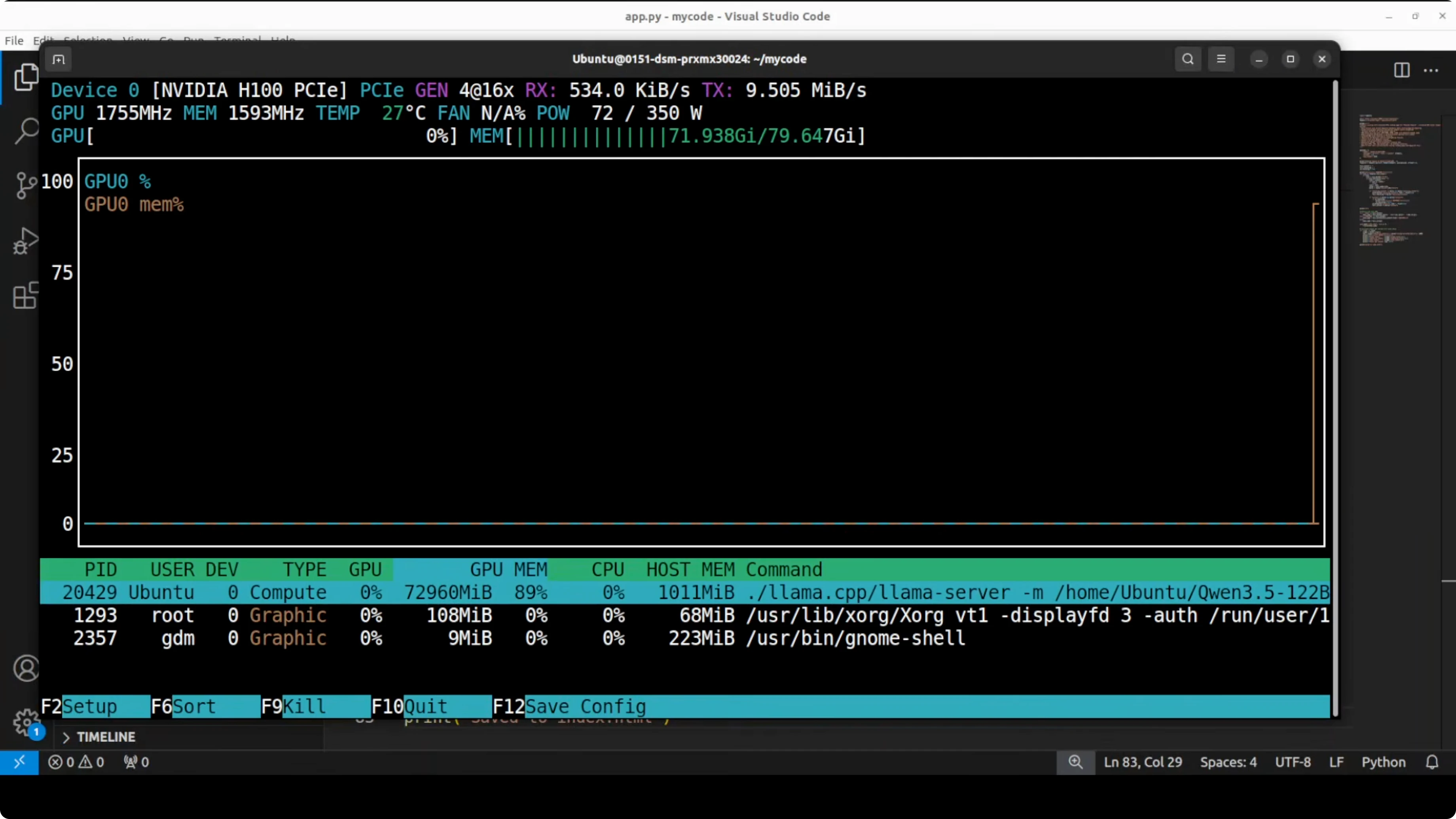 -c 262144 -ngl 100 -t 16 -p 8080 --host 0.0.0.0This loads the Q4_K_M quant into GPU memory and serves an OpenAI-compatible API at http://localhost:8080. On my H100 80 GB, VRAM usage settled around 73 GB once loaded.