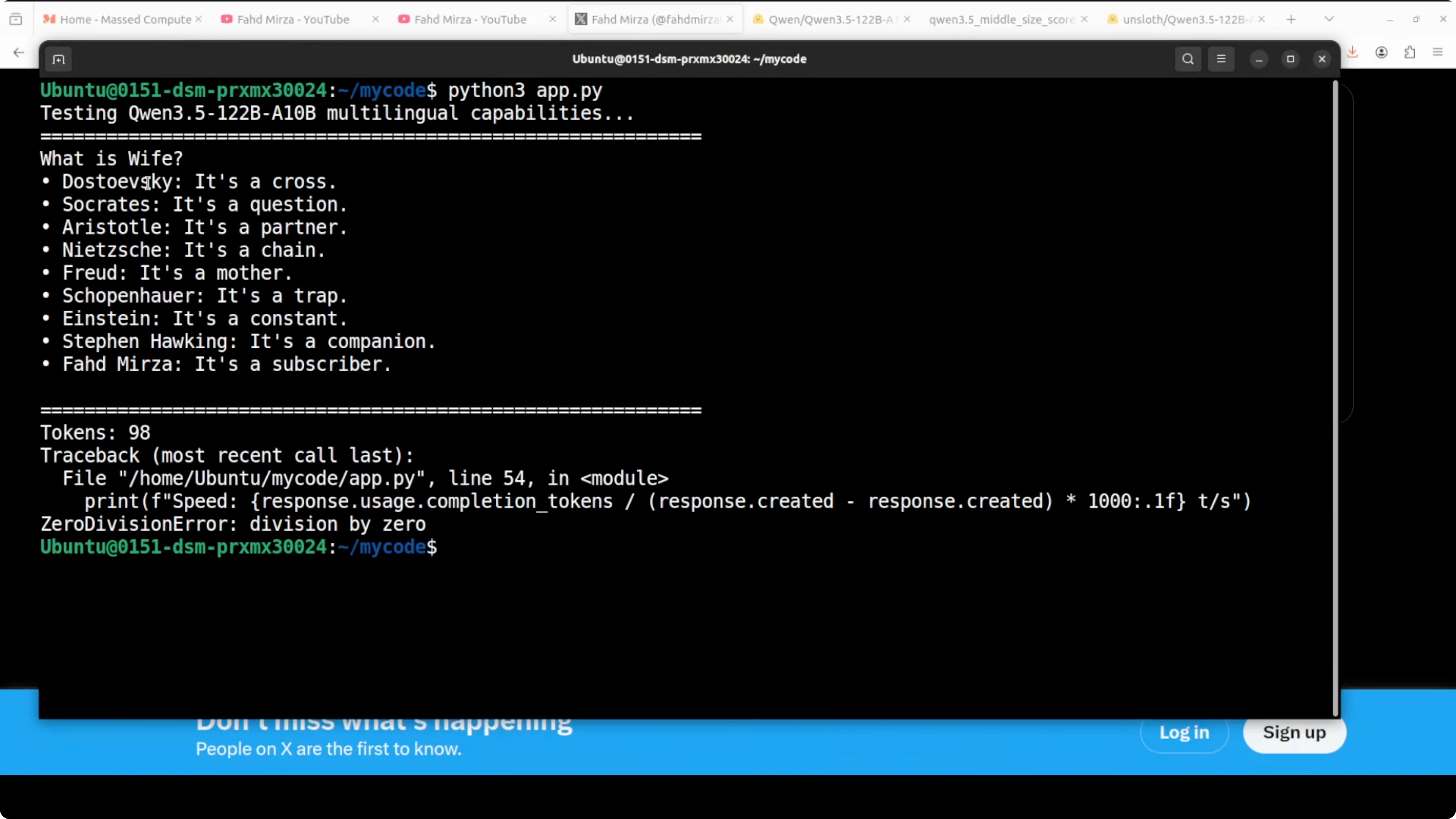 I tested a short prompt with philosophers and the question “What is life?” followed by “What is wife?” using the same concise style. The model replied with tightly focused, witty one-liners like “It’s a cross,” “It’s a question,” “It’s a partner,” “It’s a chain,” “It’s a mother,” “It’s a trap,” “It’s a constant,” “It’s a companion,” and “It’s a subscriber.” It was short, targeted, and nuanced.