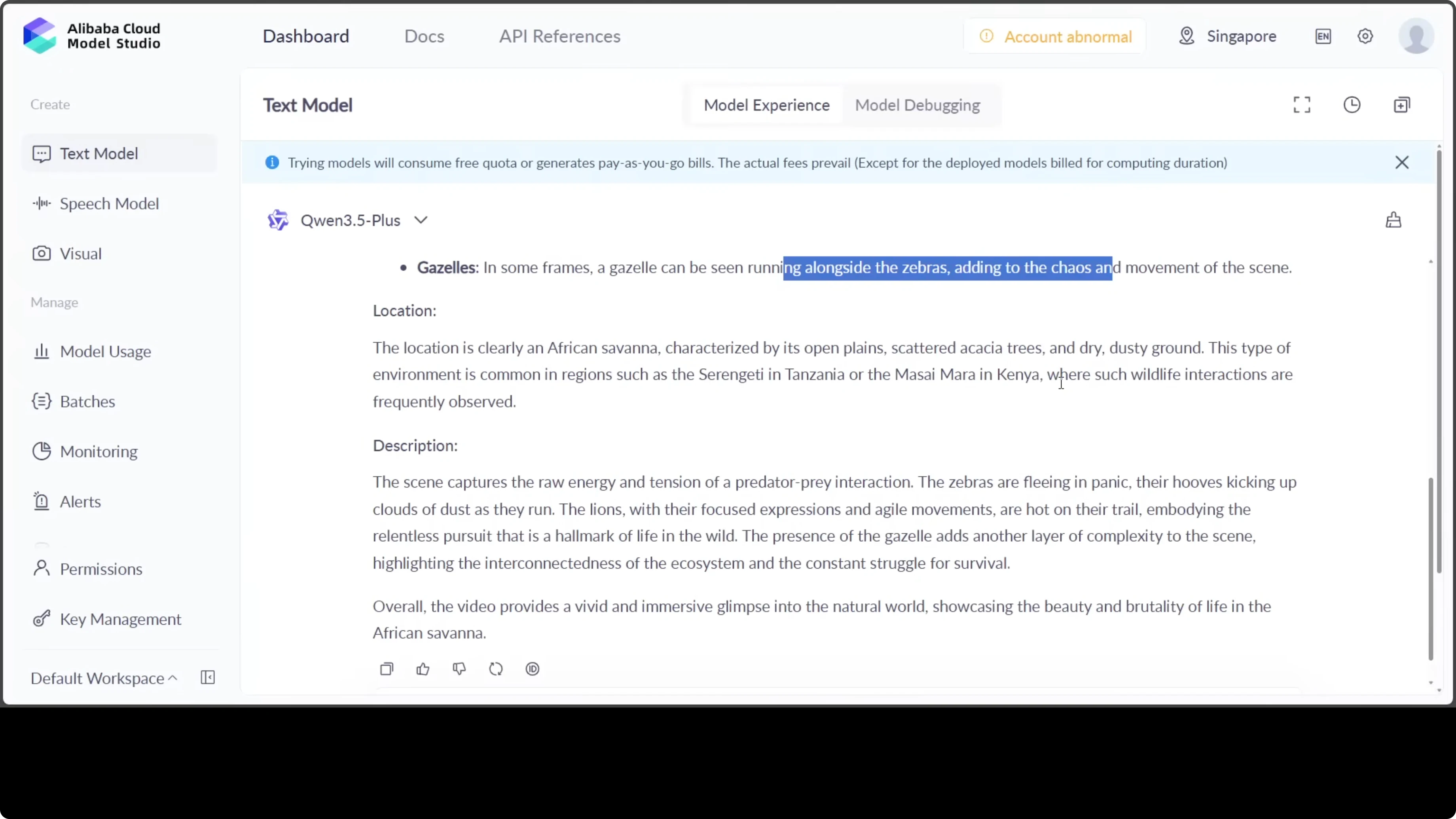It answered with African savana where a group of zebras is being chased by two lions. The environment is dusty and open with sparse vegetation. The language of Qwen models has improved a lot.