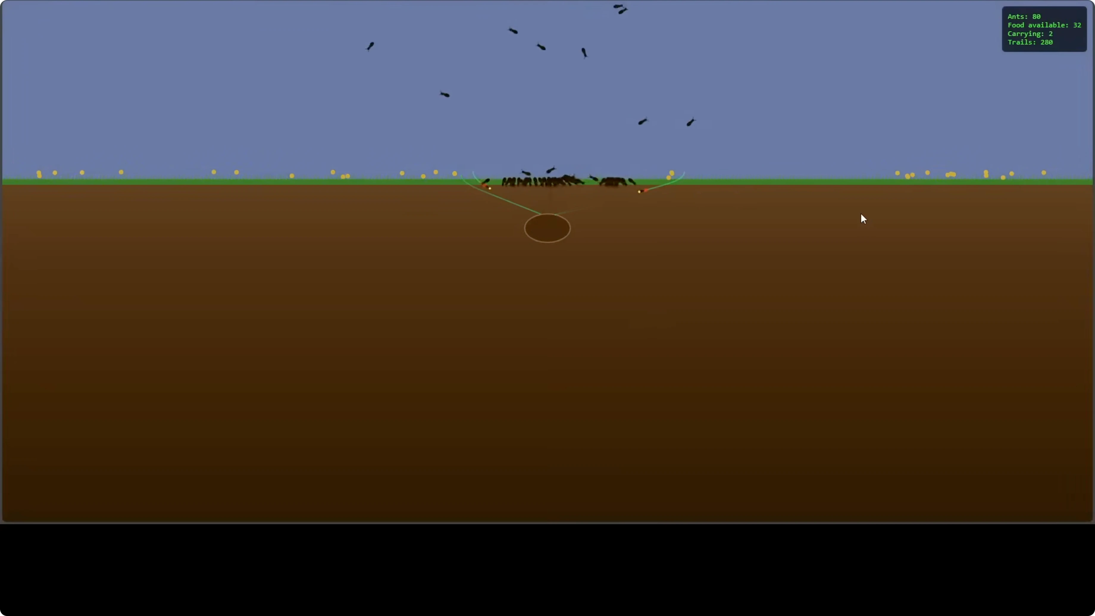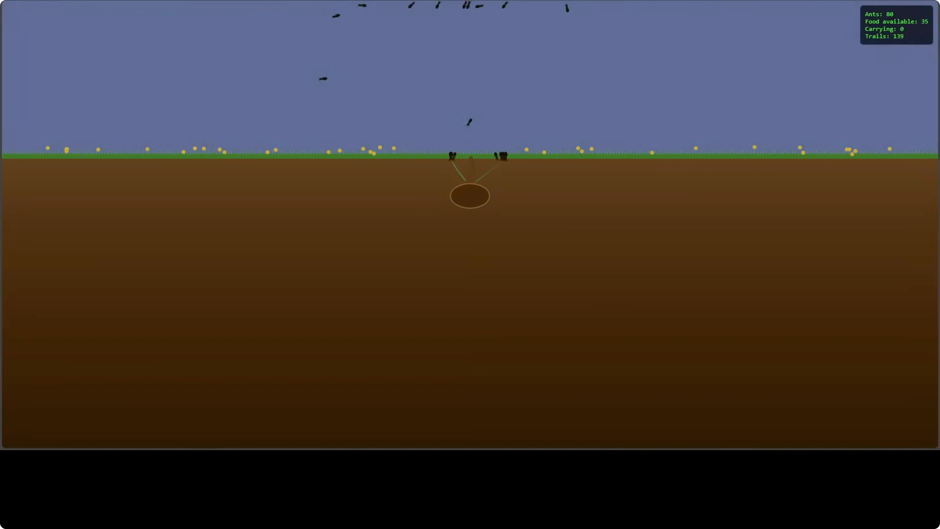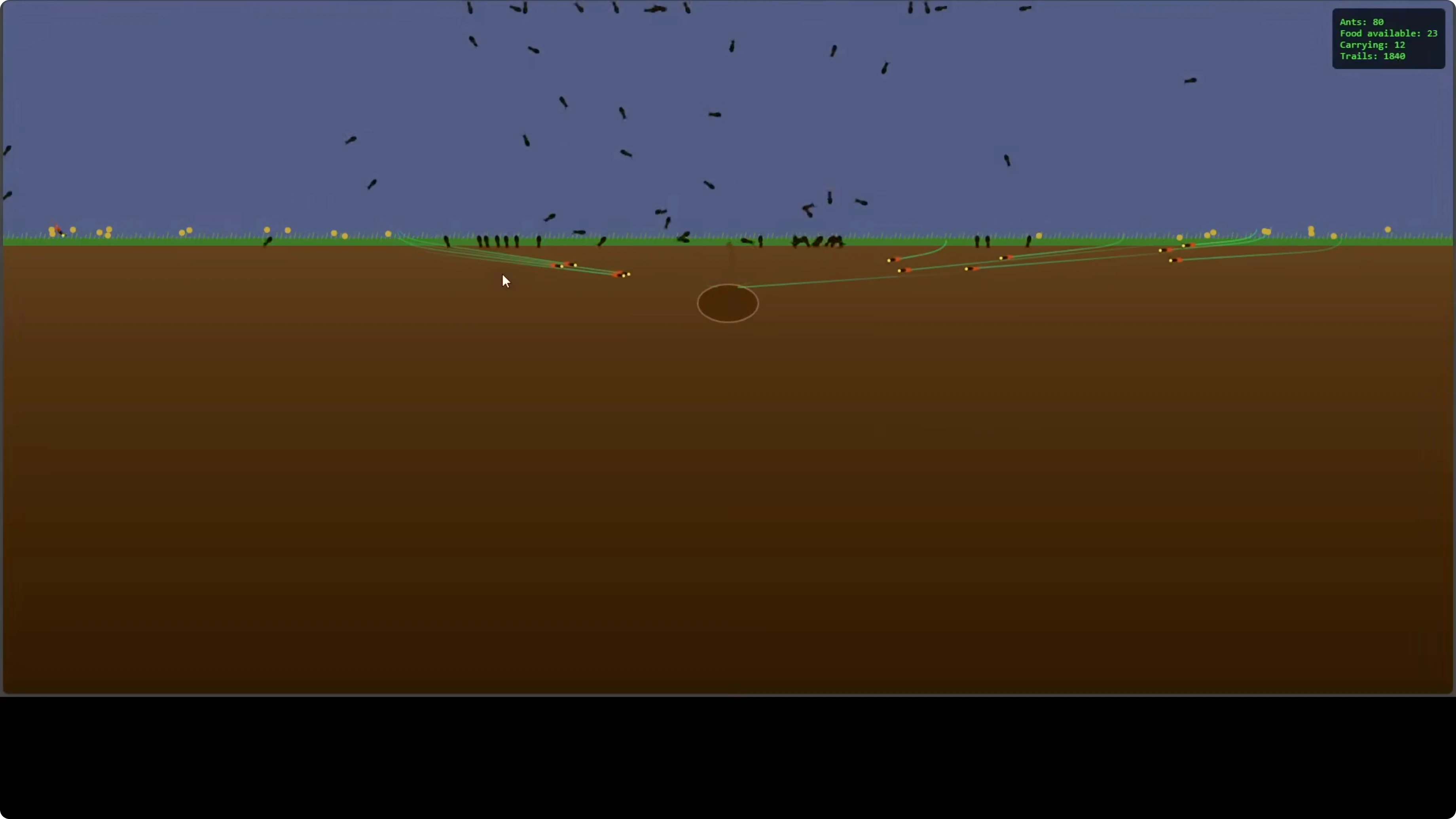 Write a single-file JavaScript simulation of a living ant colony with underground activity, particle scattering, pheromone trails, full life cycle visibility from eggs to larvae to adults, dynamic environment, and UI overlays showing counts like total ants, food available, and trail strength.