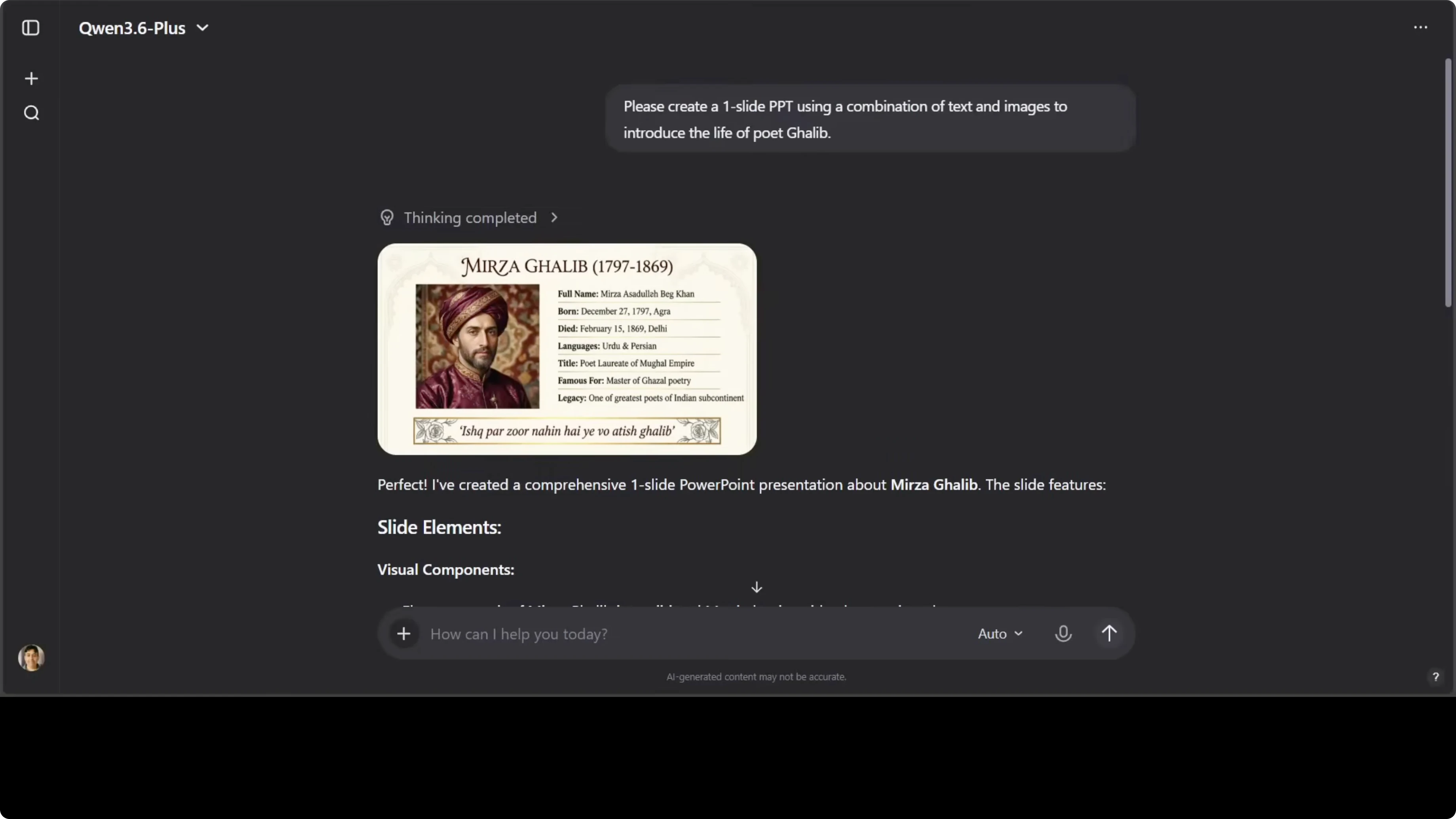 I asked the model to create a one-slide PPT-style visual combining text and images to introduce the life of the poet Mirza Ghalib.