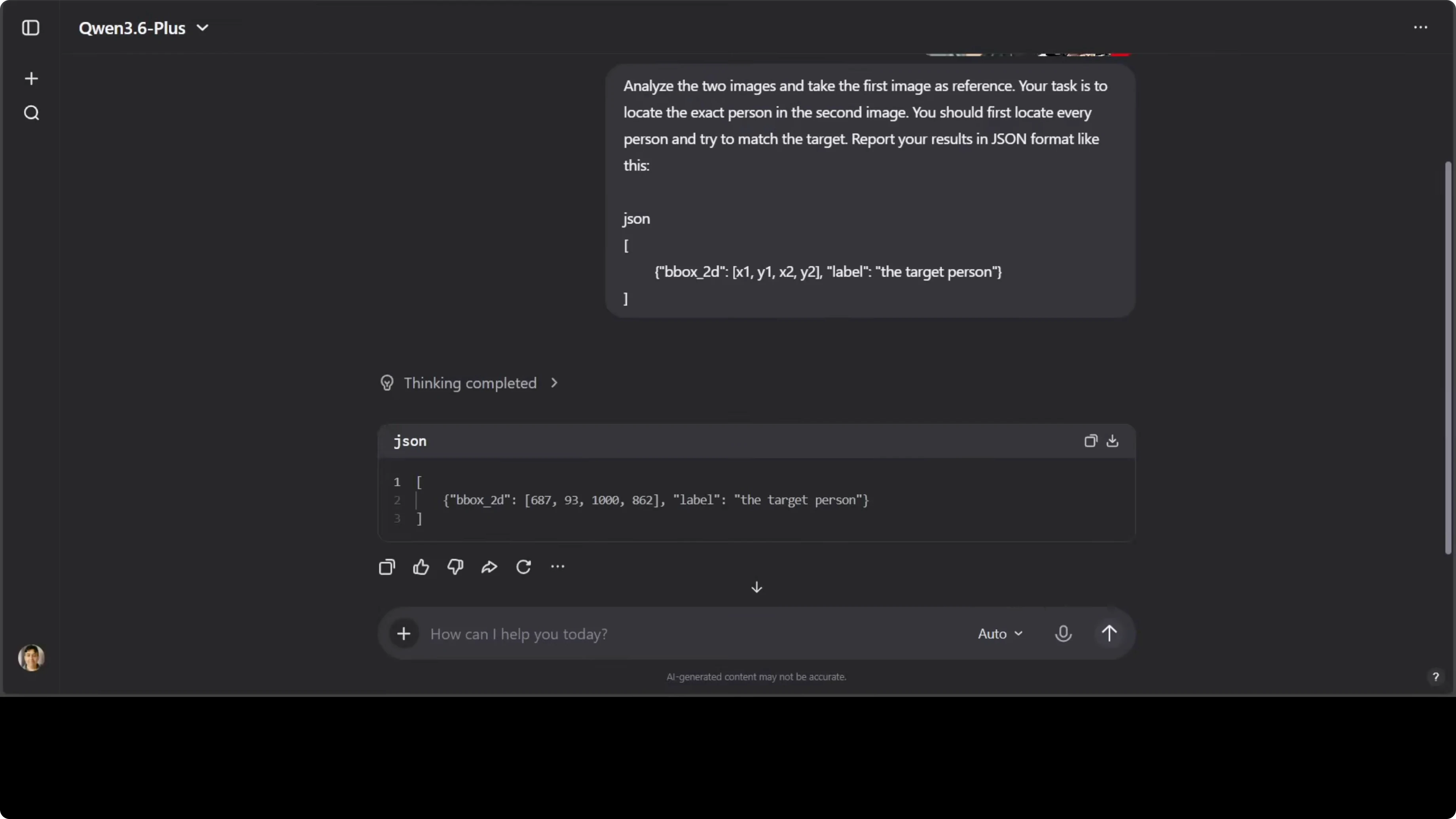 The model returned a bounding box that was correct on inspection. The JSON structure was coherent and aligned with detection outputs expected for follow-up automation. This is useful for identity matching workflows in photo libraries or surveillance review.