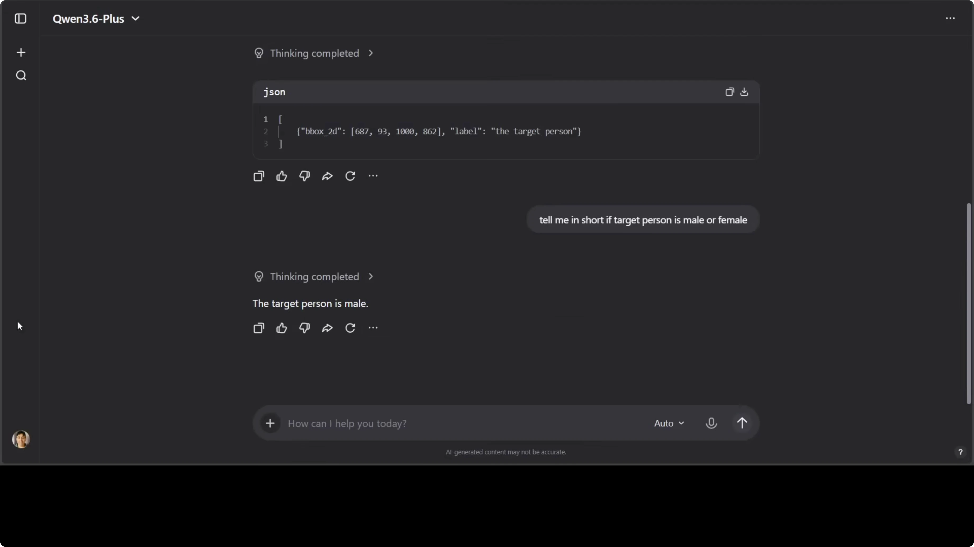 It responded correctly with male for the target. This short classification often trips models, but Qwen 3.6 handled it cleanly. It is still advisable to treat such attributes with caution depending on policy constraints.