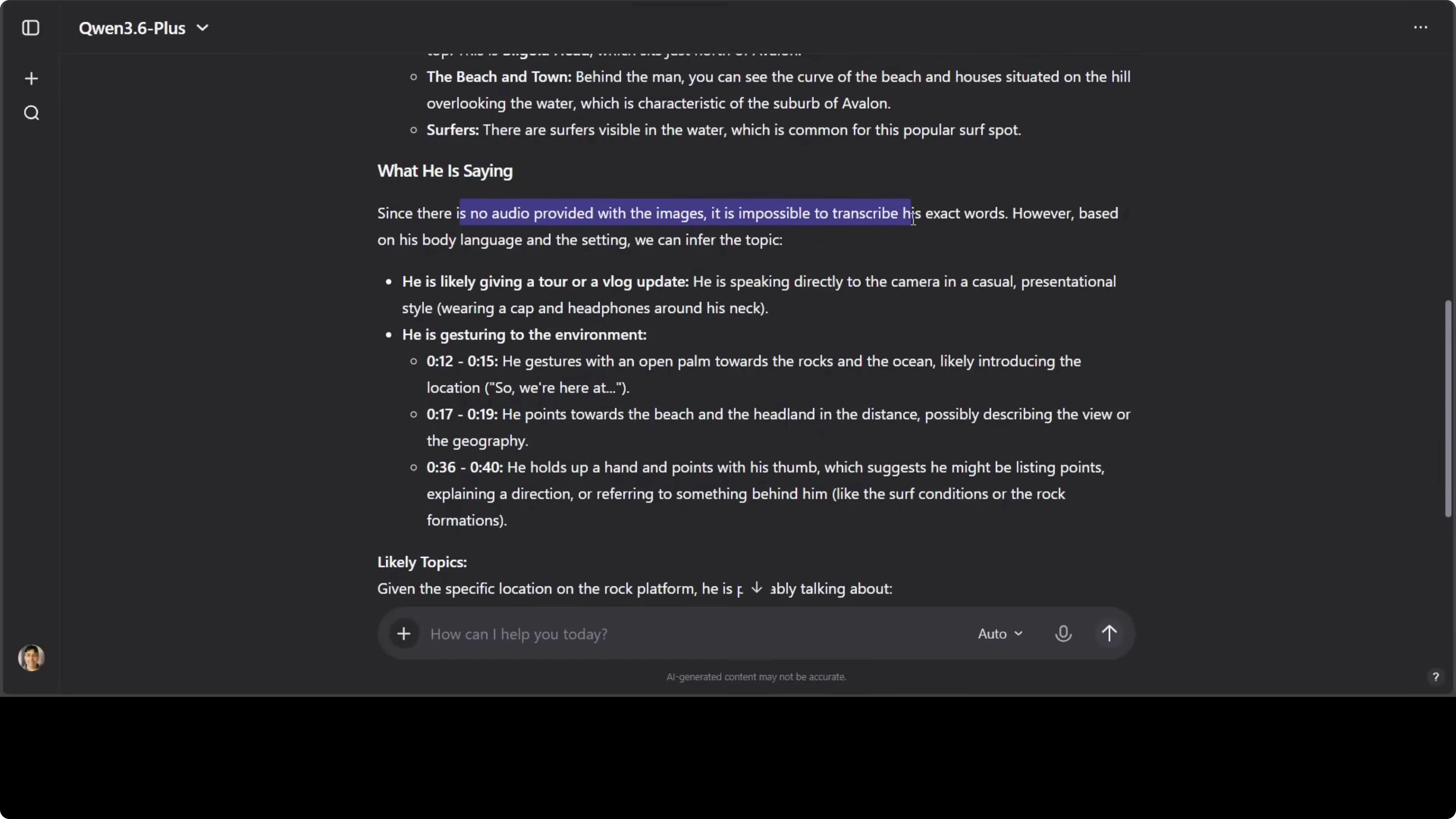 The model described northern beaches near Sydney but guessed Avalon Beach instead of Avoca Beach. It stated there was no audio provided and based its answer on video frames, suggesting it did not extract audio from the clip in this run. Gesture and scene descriptions were accurate, but the specific beach identification was wrong.