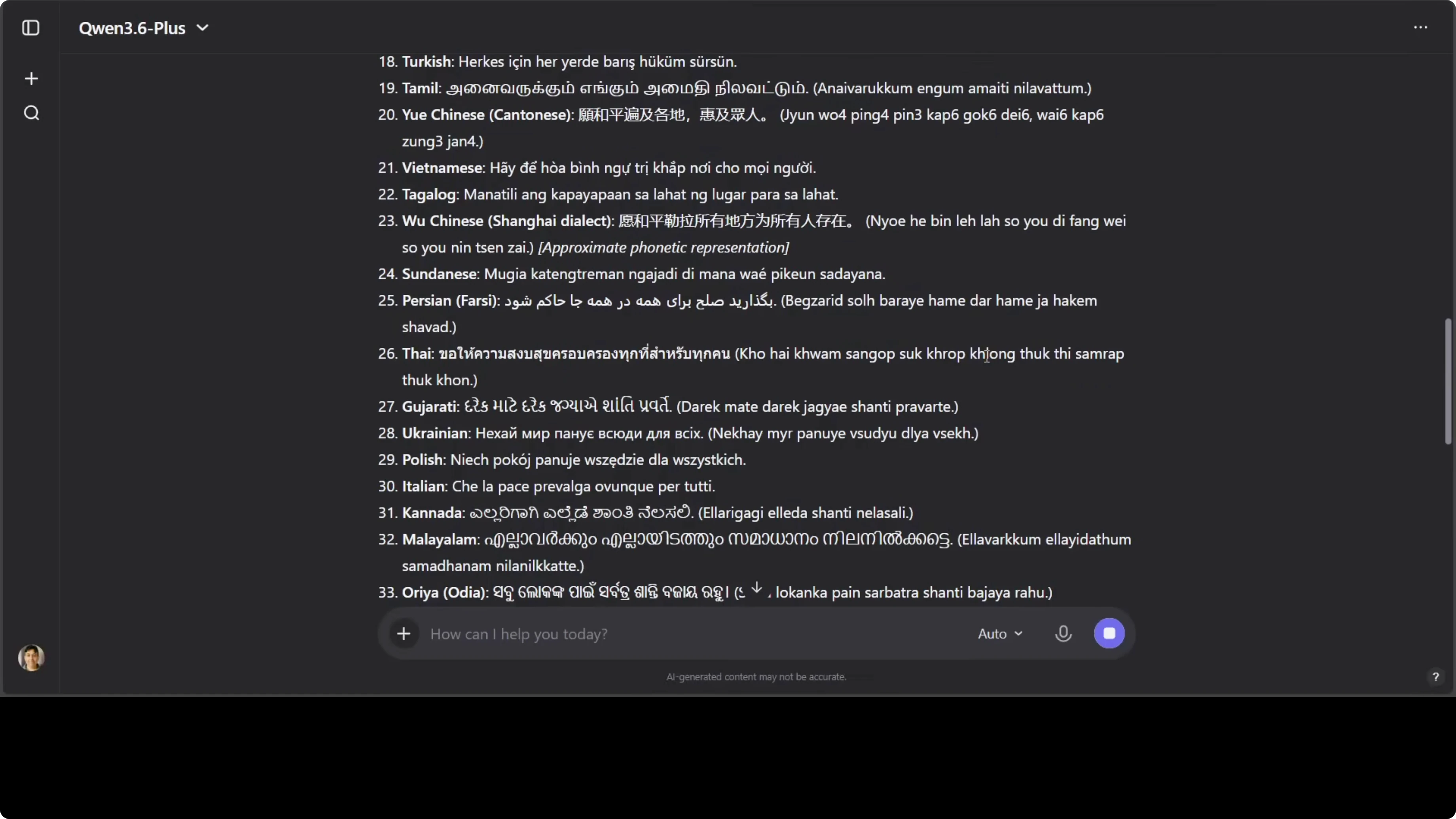 Most translations looked correct with a few mistakes in low-resource languages. Native speaker review is still recommended for production-quality localization. Qwen 3.6 is capable here, but quality depends on the target language.