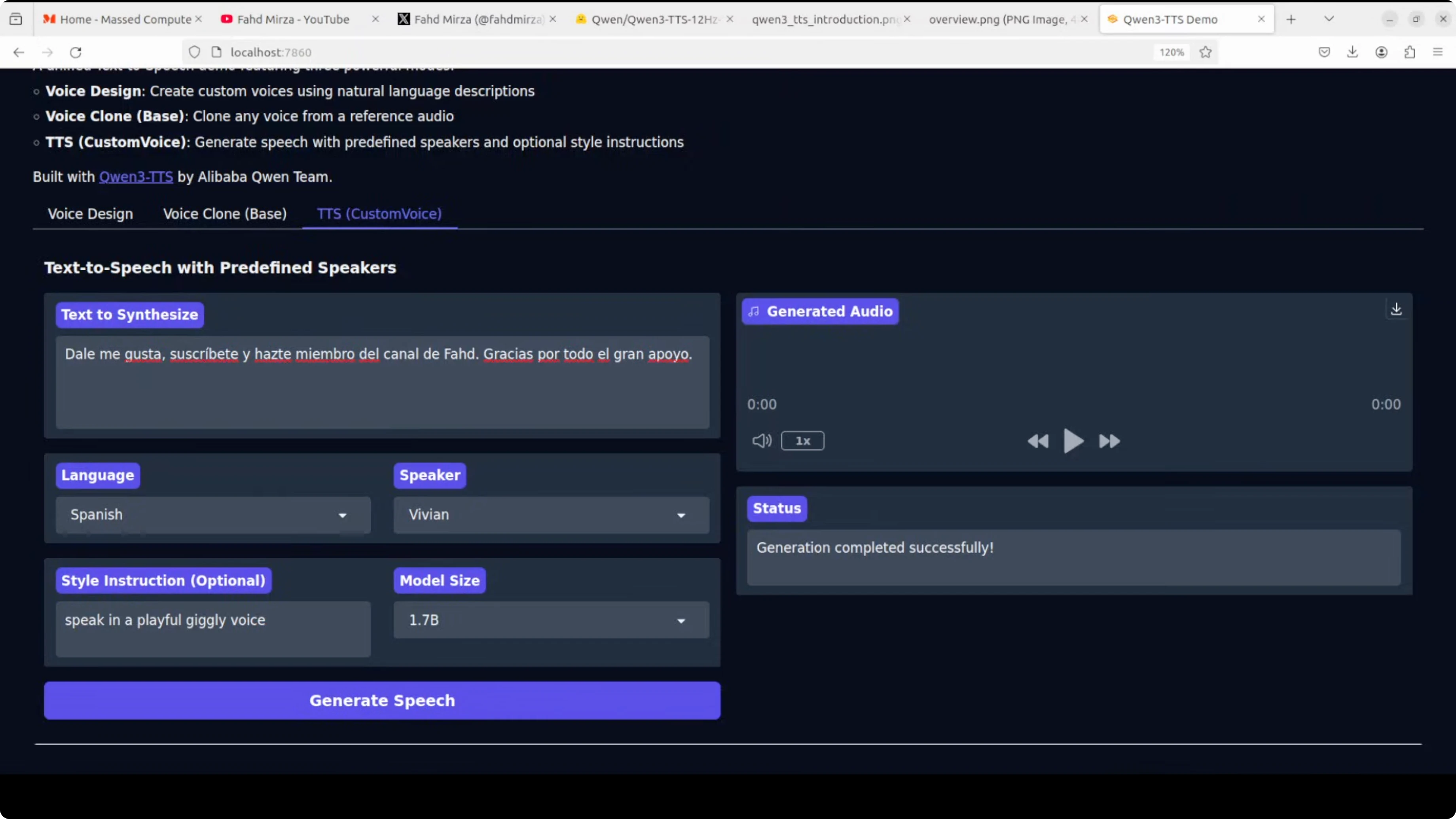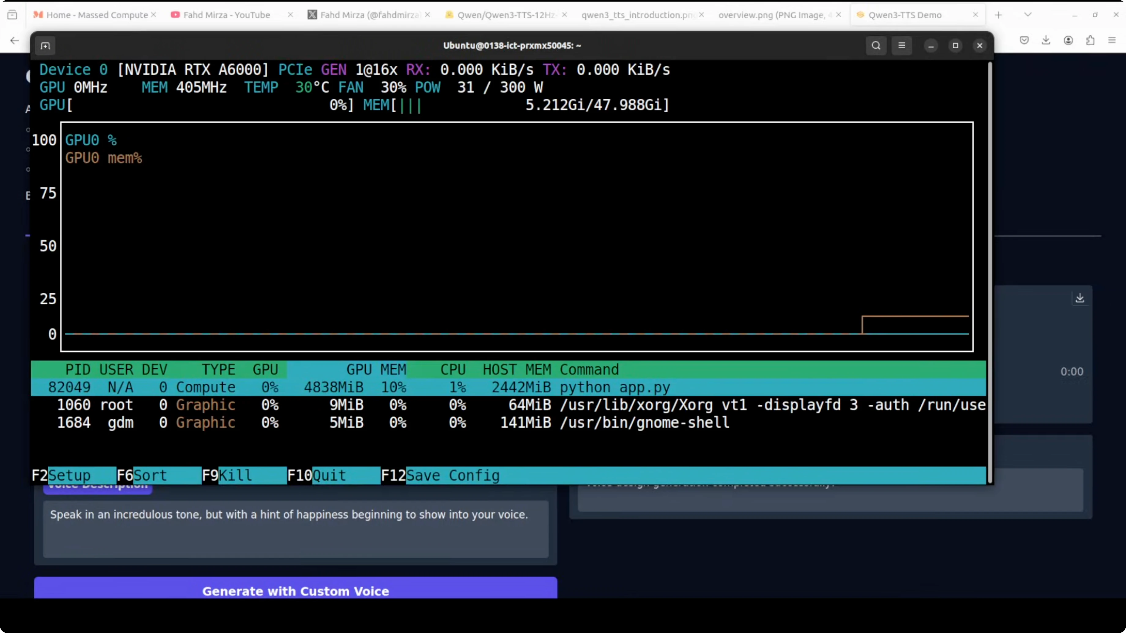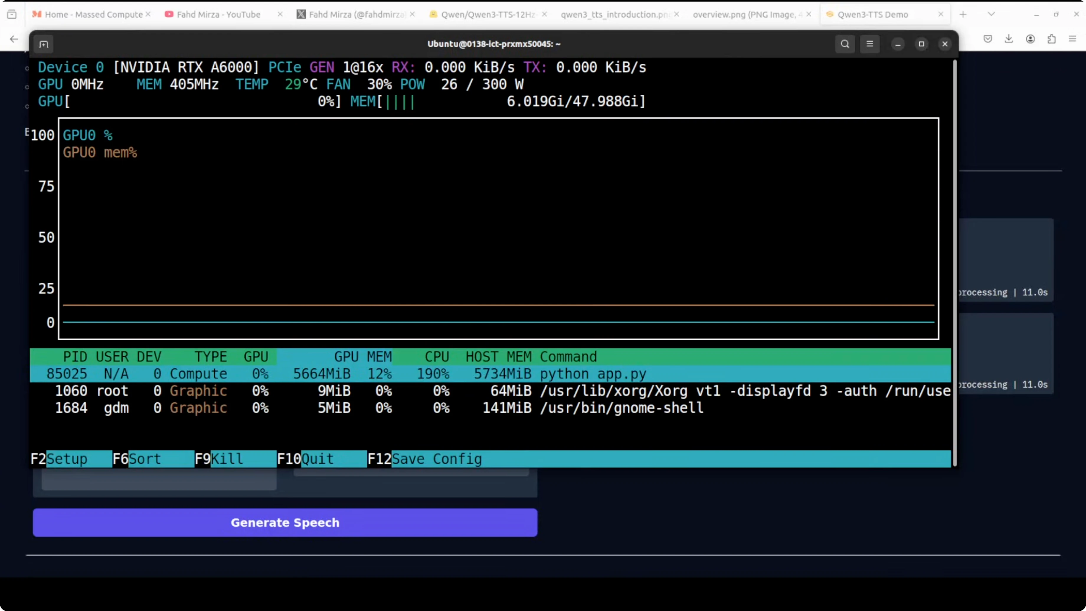 - My VRAM consumption during TTS was close to 5 GB, and I saw it reach about 5.7 GB during custom voice generation.