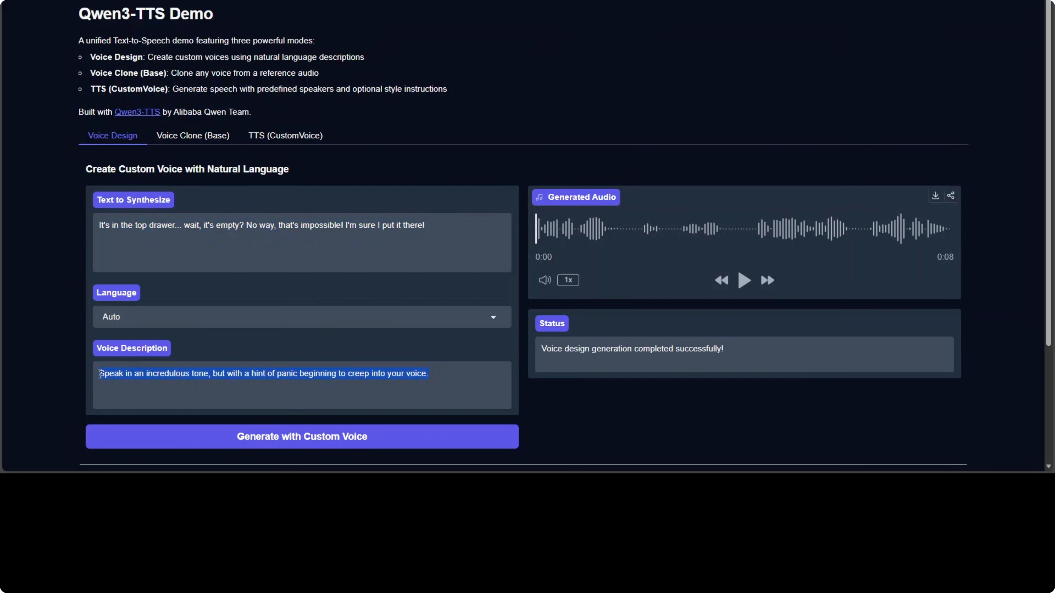 Qwen team has open sourced their Qwen 3 TTS model. You can design your own voice, clone your own voice, or simply use it for text-to-speech. Here is a quick taste of what it can do: I took the text "It's in the top drawer. Wait, it's empty." and used a voice description of "speak in an incredulous tone but with a hint of panic beginning to creep into your voice." The result captured that style brilliantly.