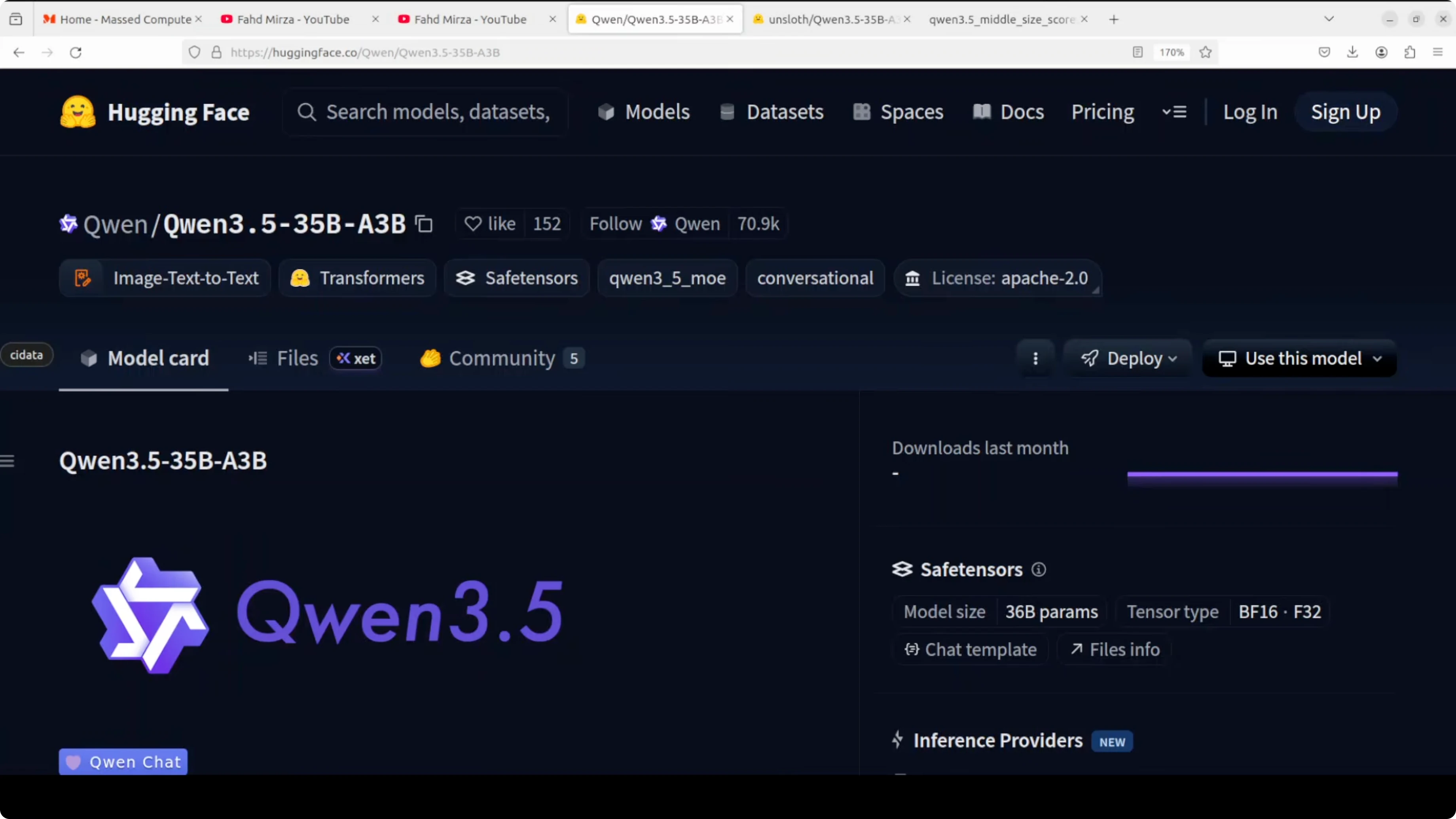 I just covered the 27 billion parameter dense model, and now I’m installing the mixture-of-experts Qwen 3.5 35B A3B model that looks promising too. It has 35 billion total parameters but only activates roughly 3 billion per token. You get the knowledge of a 35B model at the compute cost of a much smaller one.