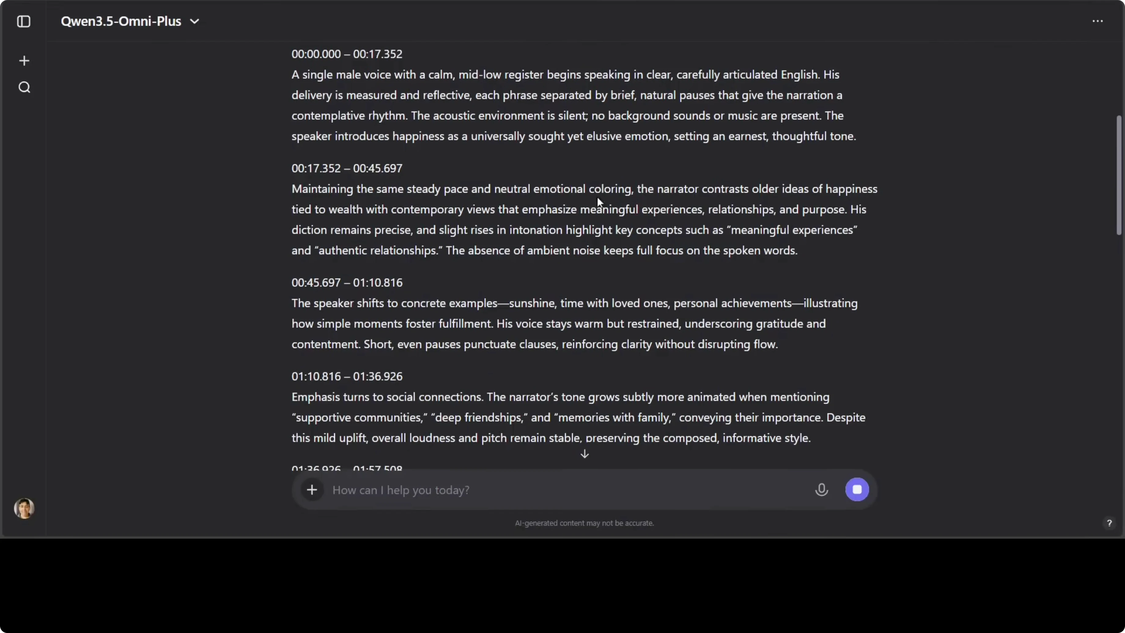 I uploaded a 3-minute audio in my voice and asked for a detailed description, a chronological storyline of everything heard, timestamps, speaker identification, and emotional tone. The output was millisecond-accurate, with correct speaker profiling including age, accent, Hertz range, WPM, and per-segment prosody tags. It also added environmental and microphone analysis unprompted, and the semantic understanding of the content was strong.