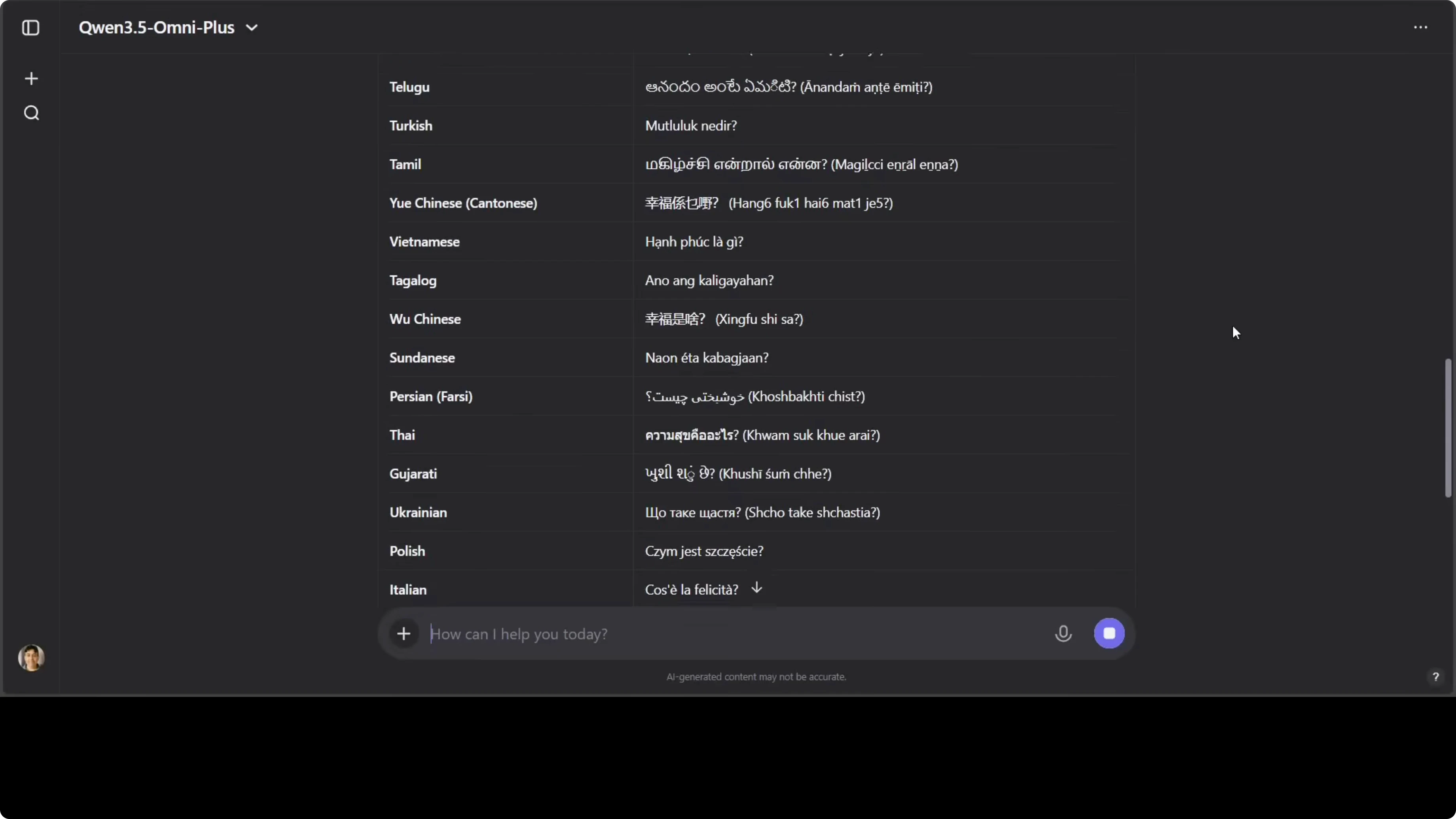 I asked the model to translate a short audio clip saying “What is happiness?” into around 52 to 55 world languages. As far as I can tell, the translations are strong, with some literal variations for regional and low-resource languages. Overall quality is high for quick multilingual coverage.