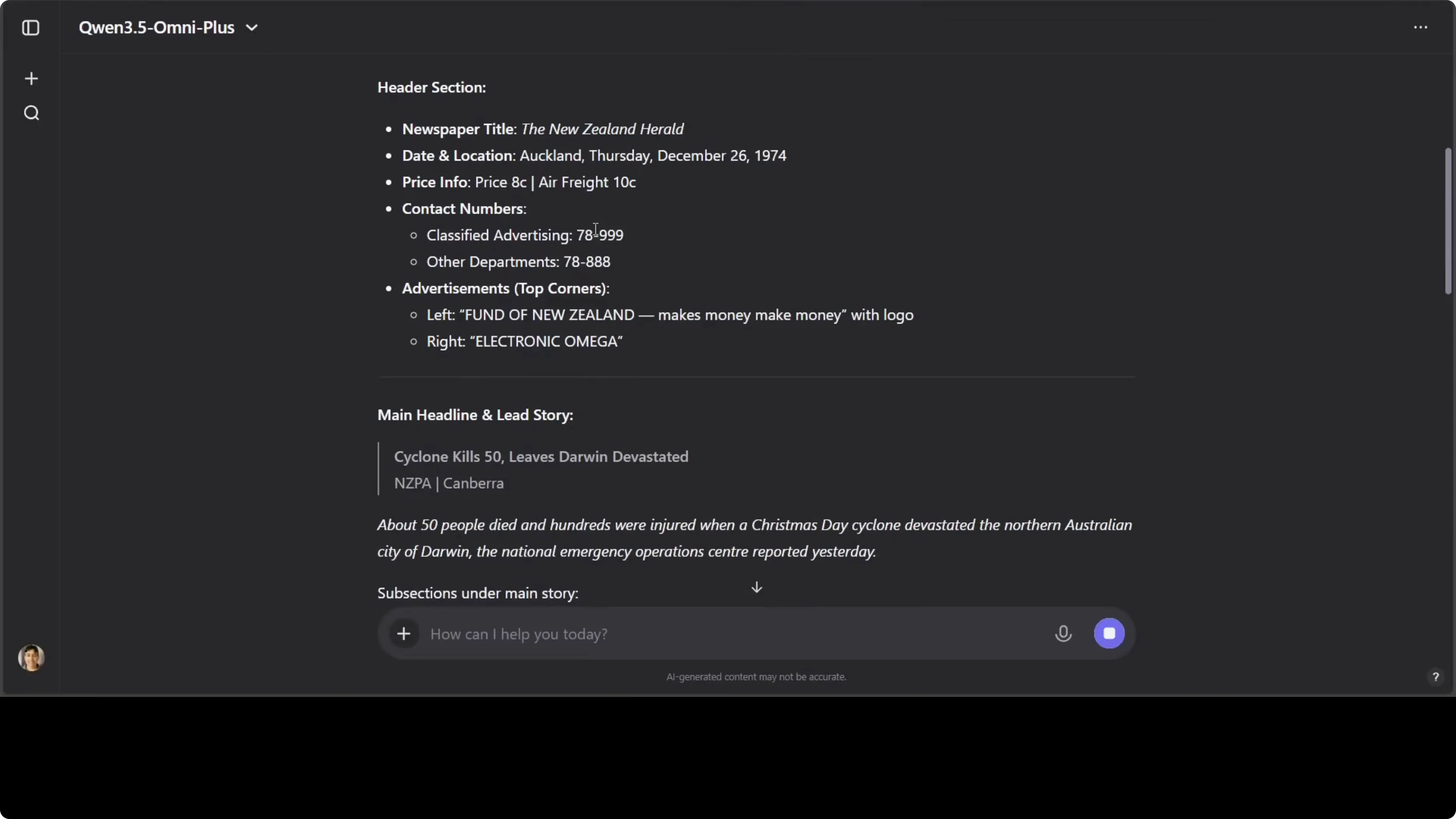 I tested OCR on an old archive newspaper scan from the New Zealand Herald that covered a cyclone in the 1970s affecting Darwin in Australia’s Northern Territory. The model correctly identified headers, contact numbers, ads, the main headline, subsections, and photo captions, and it extracted a lot of body text. It also produced a concise one-paragraph summary that read cleanly.