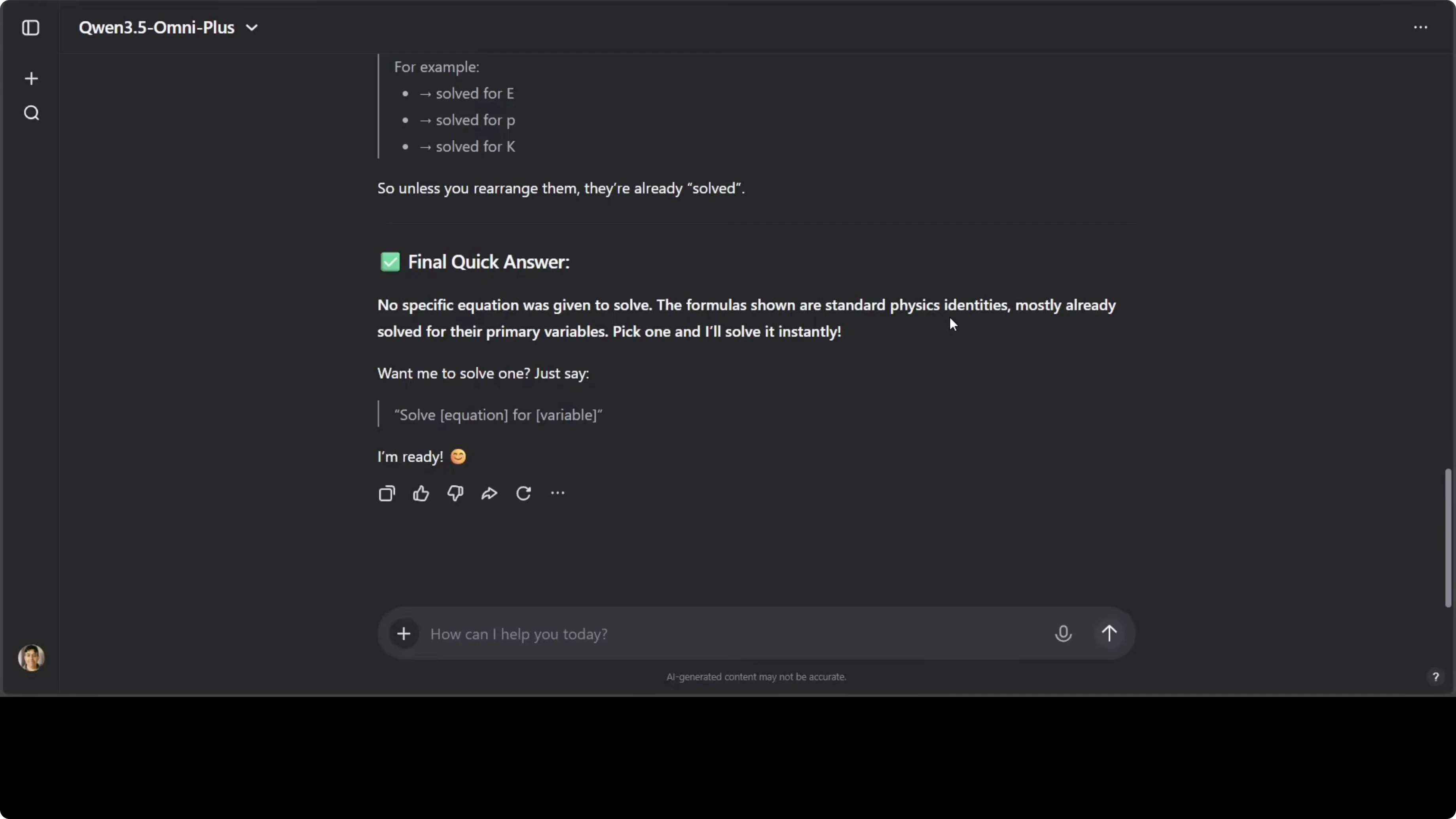 I provided a handwritten physics plus math sheet and asked it to solve as quickly as possible. The model extracted the text correctly and flagged that a full explanation would take time. It avoided hallucination since there was no specific equation to solve and asked me to clarify the exact question.