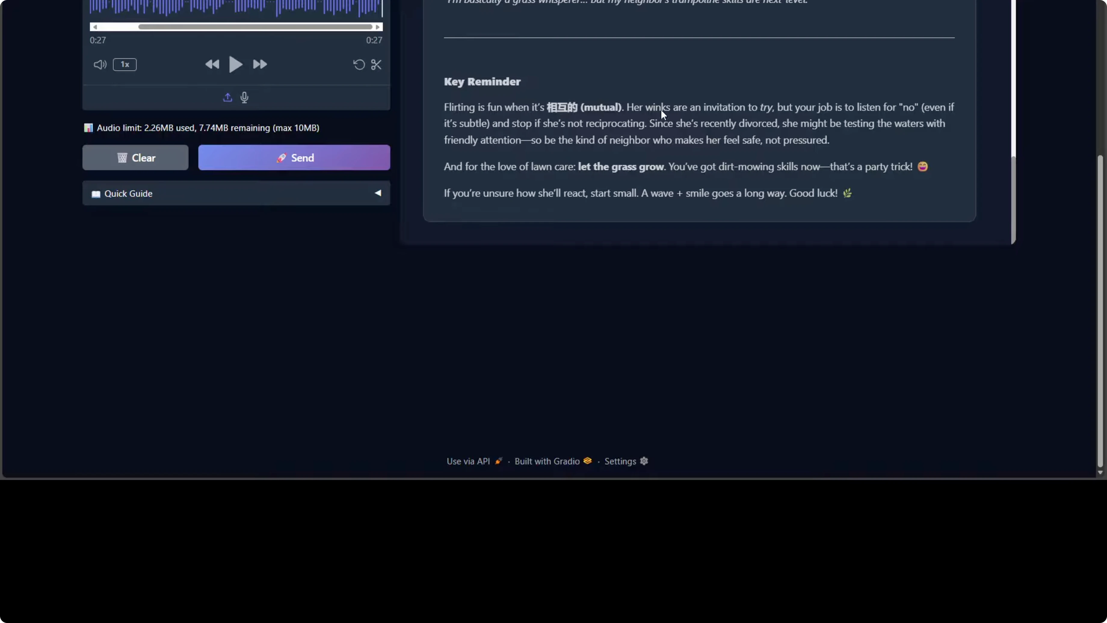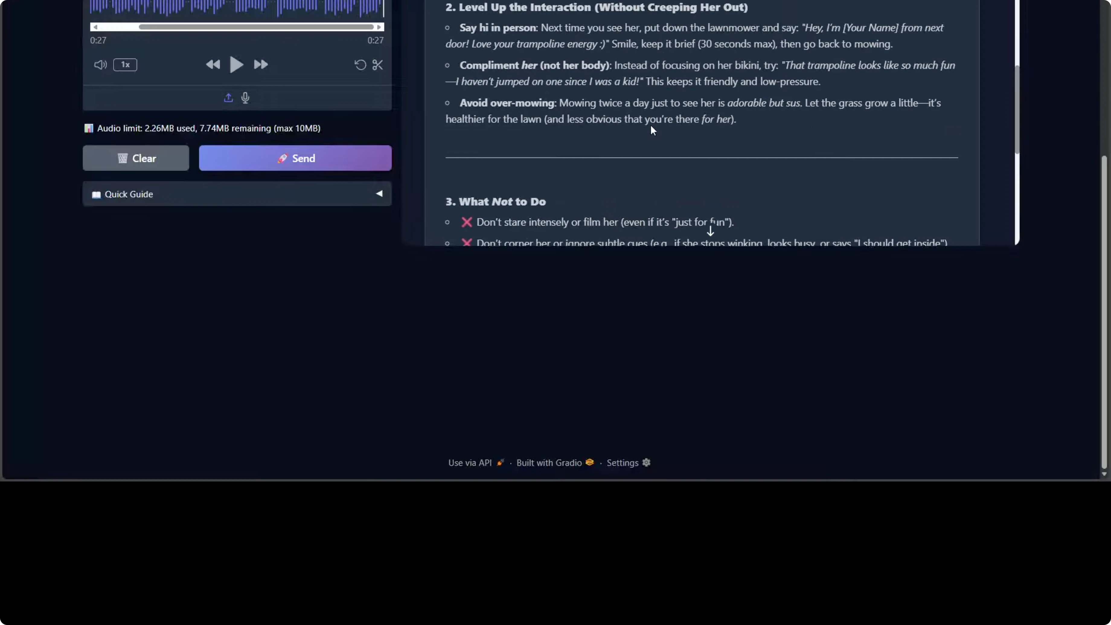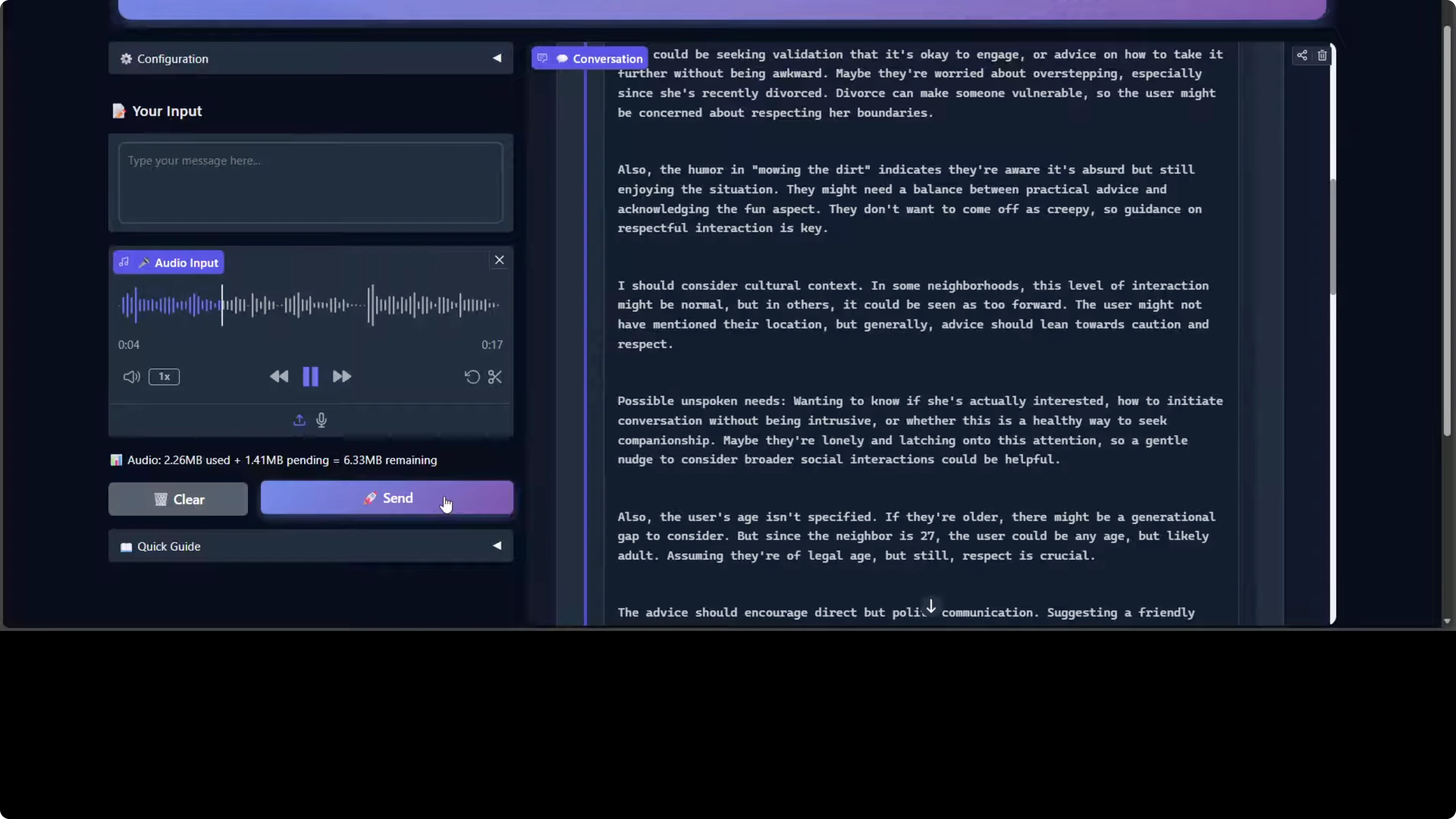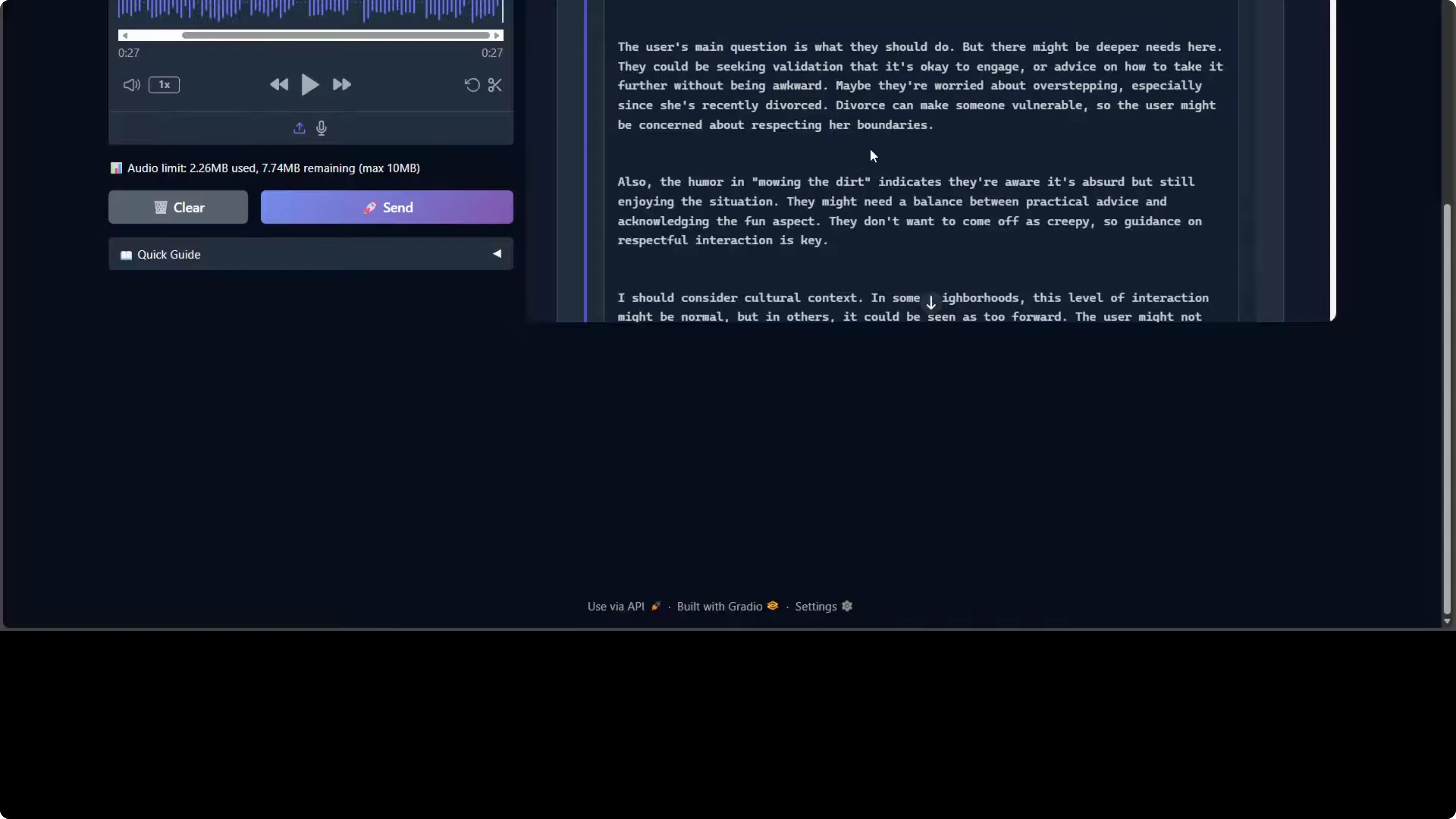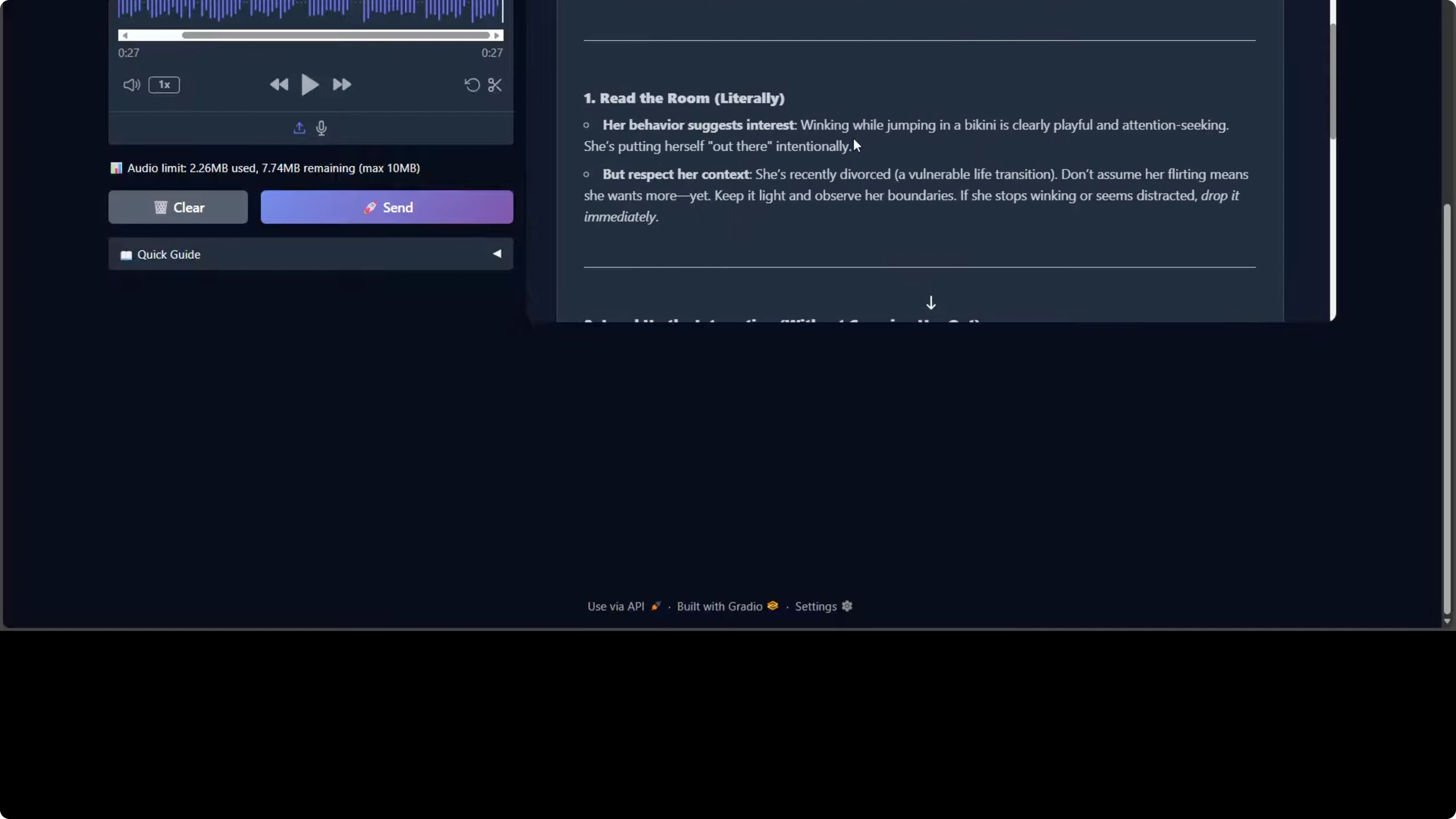 The model processed it and responded. If you critically go through this response, the model is demonstrating strong social reasoning and emotional intelligence. It correctly identifies the implicit request for dating advice beneath the humorous framing. It also shows nuanced contextual awareness by flagging the neighbor's recent divorce as a vulnerability factor requiring sensitivity, which is really good.
