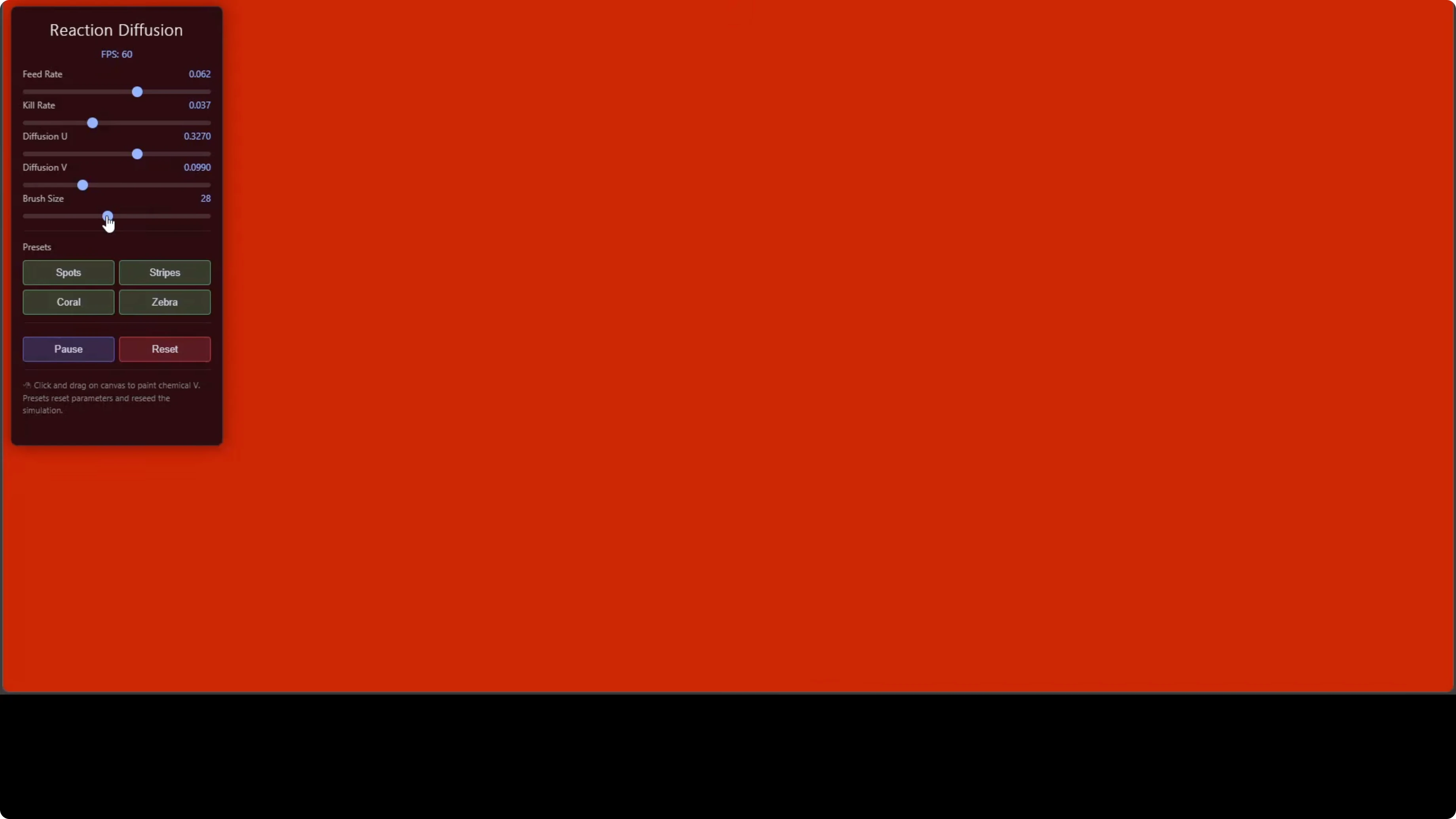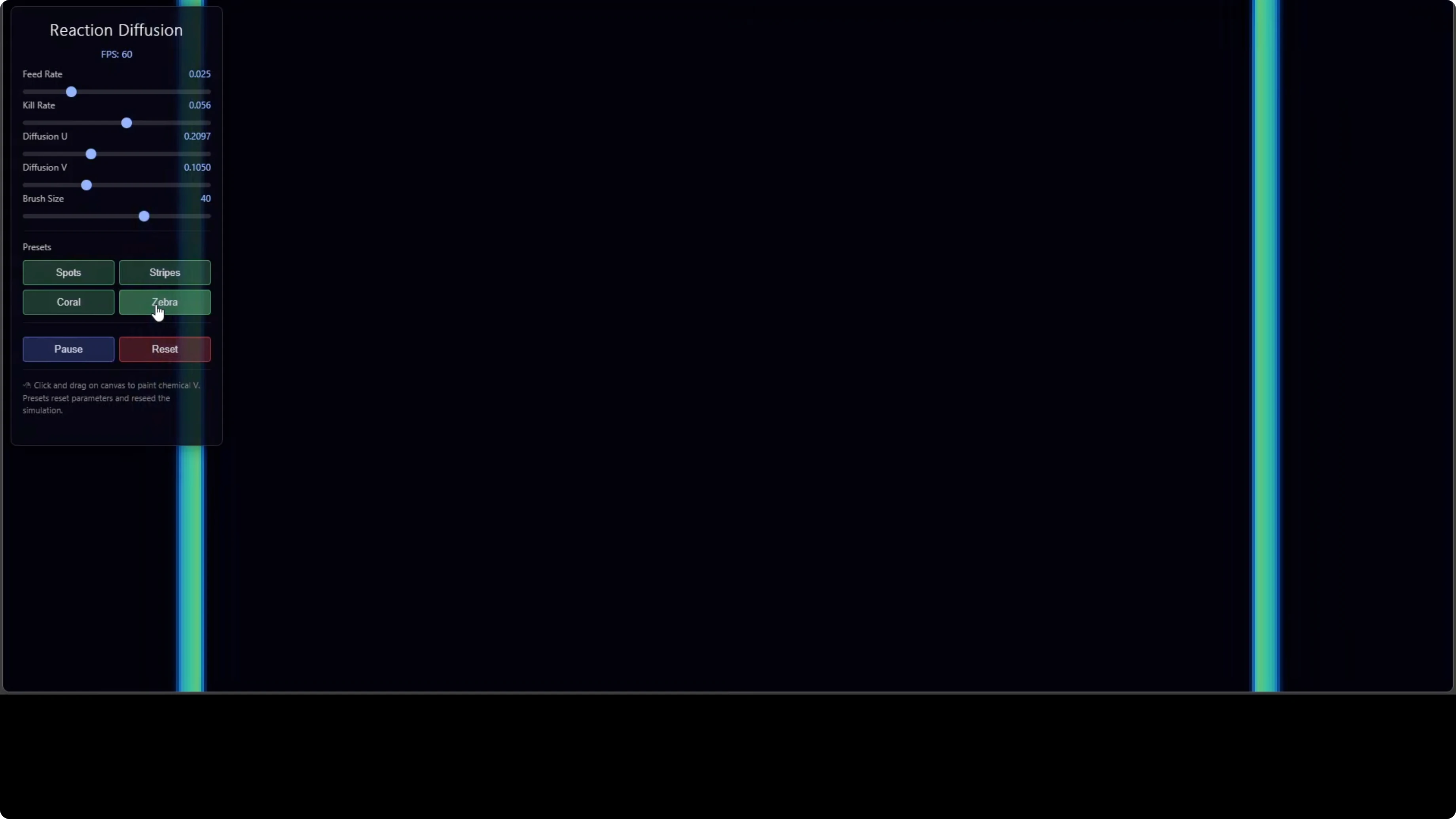 Below is a compact self-contained HTML example you can use to sanity check outputs. It runs entirely in the browser and exposes feed, kill and diffusion controls with zebra and coral presets.
