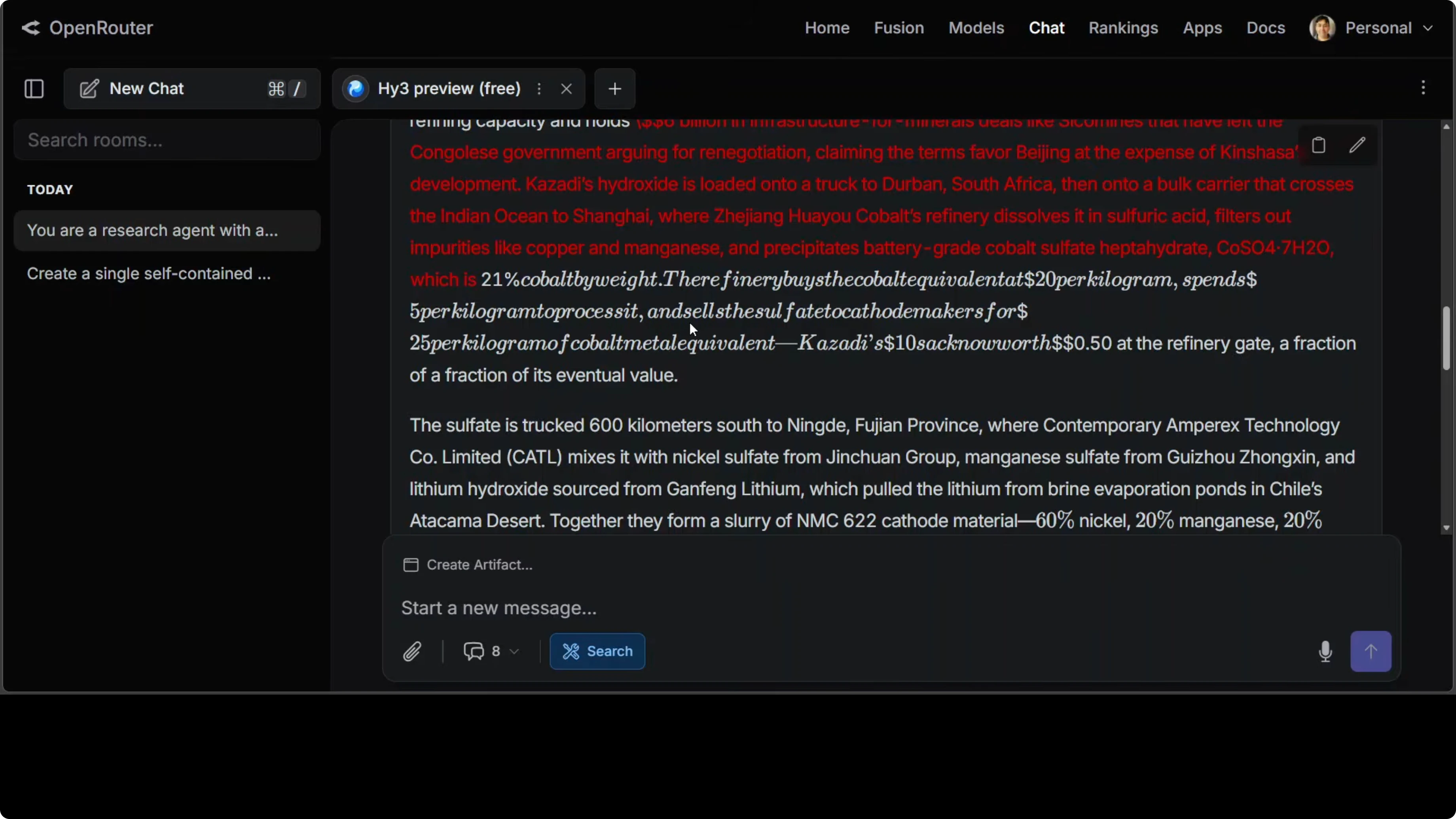 Act as a research agent with access to web search. Trace the end-to-end supply chain of a single lithium-ion battery cell, starting from cobalt extraction in the DRC, through chemical refining in China, cathode/anode and electrolyte production, cell manufacturing in Asia, pack integration, shipment, and integration into a smartphone. Write a single vivid narrative with specific names, coordinates, company sites, process chemicals, typical percentages, typical dollar values at each stage, and relevant legislation that touches each step. No bullets. Synthesize into flowing prose with citations inline where helpful.The model did not just trace the supply chain. It humanized both ends of it with specific names, specific numbers, and specific coordinates, which most models would not think to do unprompted. The level of technical and economic precision was remarkable, with cobalt percentages, compound names, dollar values at each stage and legislation references woven into narrative prose, which takes real synthesis, not just retrieval.