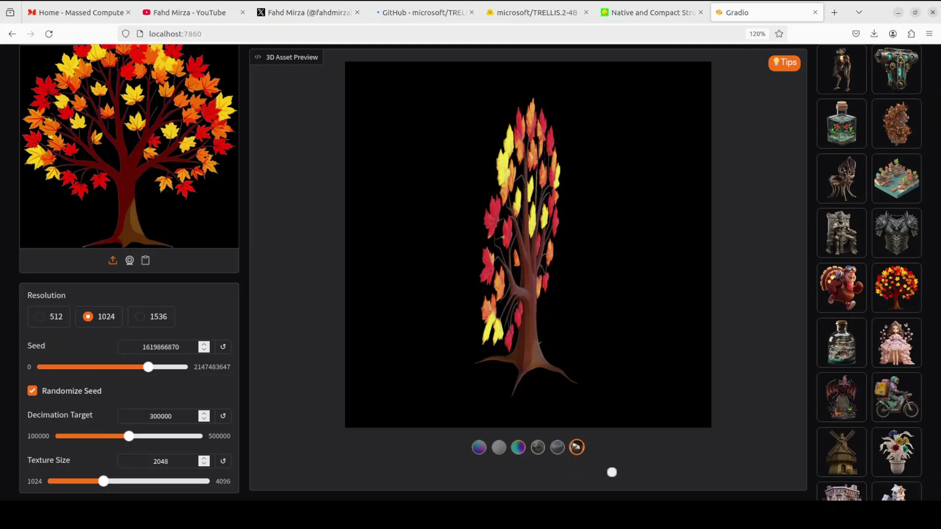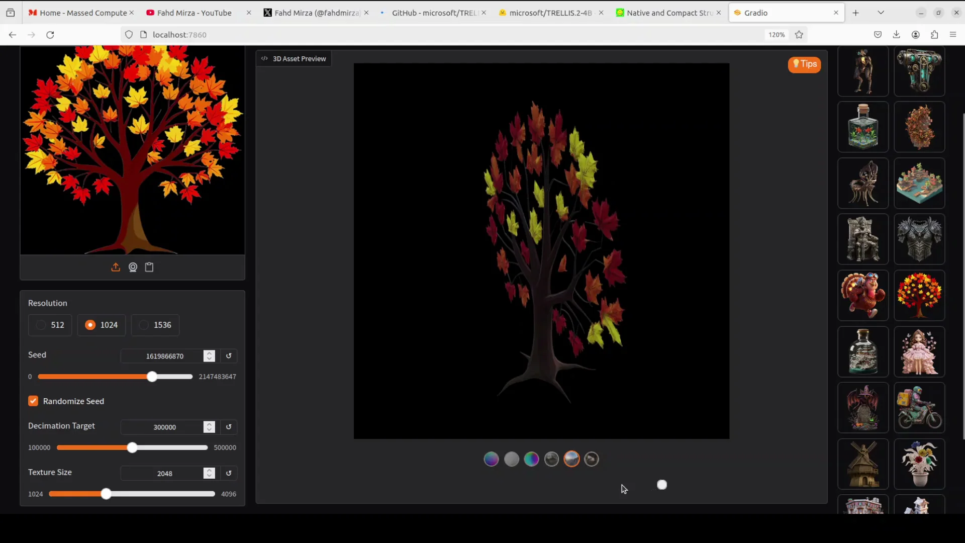 Using their example tree image from the repo, generation completed in about a minute. VRAM hovered around 16 GB during generation and spiked to just under 30 GB during rendering. Material variations look good, and switching render modes shows solid PBR responses across angles.