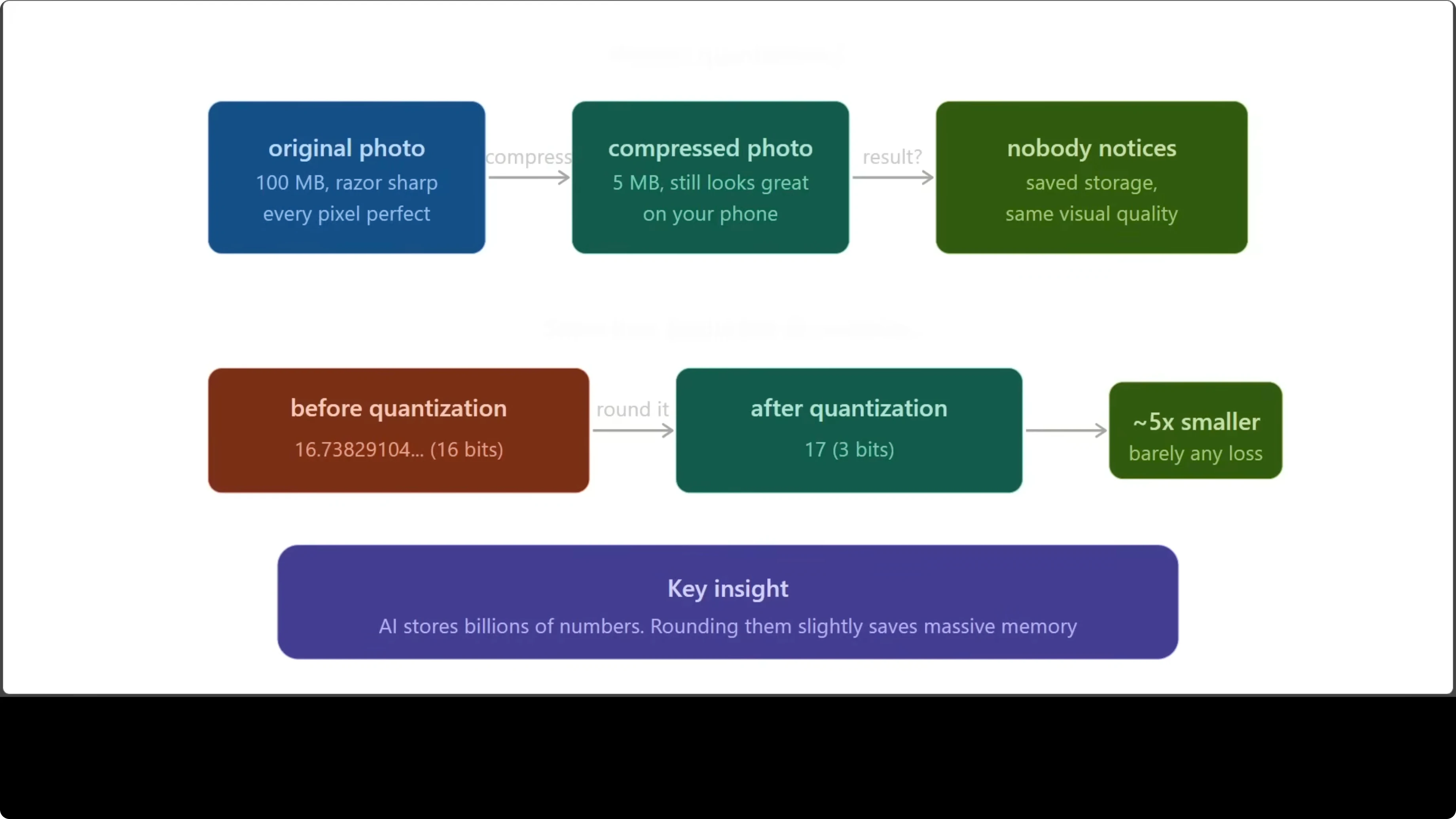 Quantization does the same to numbers. Instead of storing 16.73829104 in 16 bits, you store roughly 17 in a tiny number of bits and keep it close enough. Doing this at scale without hurting quality is the hard part.
