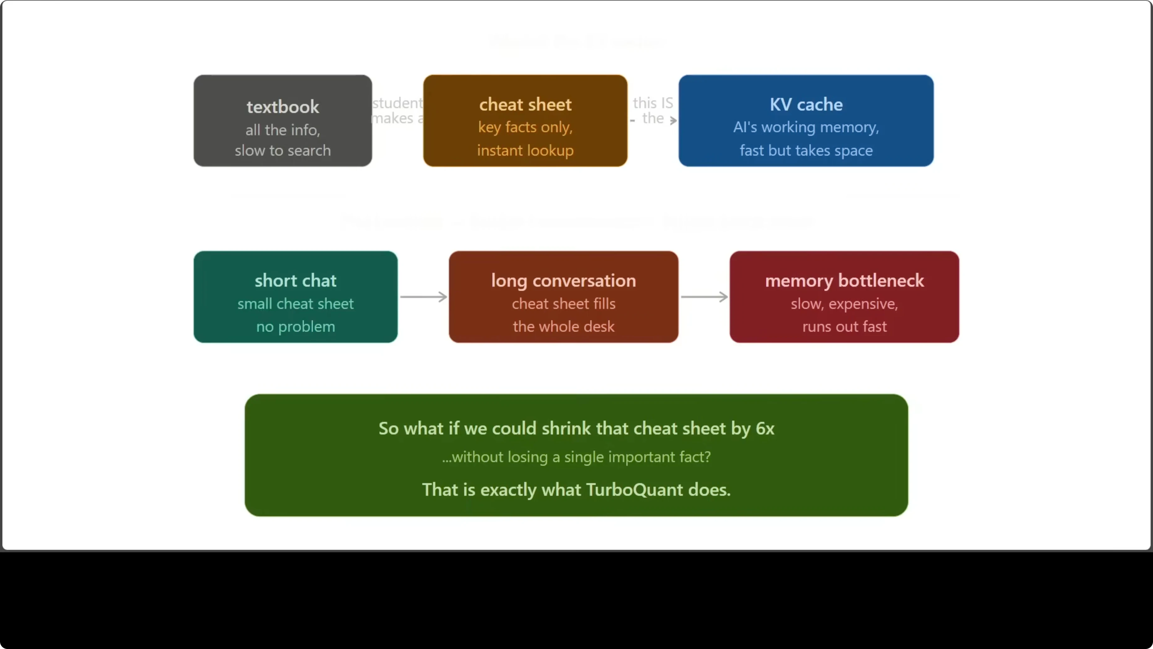 TurboQuant shrinks the KV cache by around 6x with no accuracy loss and no retraining required. That working memory is one of the biggest bottlenecks in long conversations. Making it smaller and faster matters a lot for cost and latency.