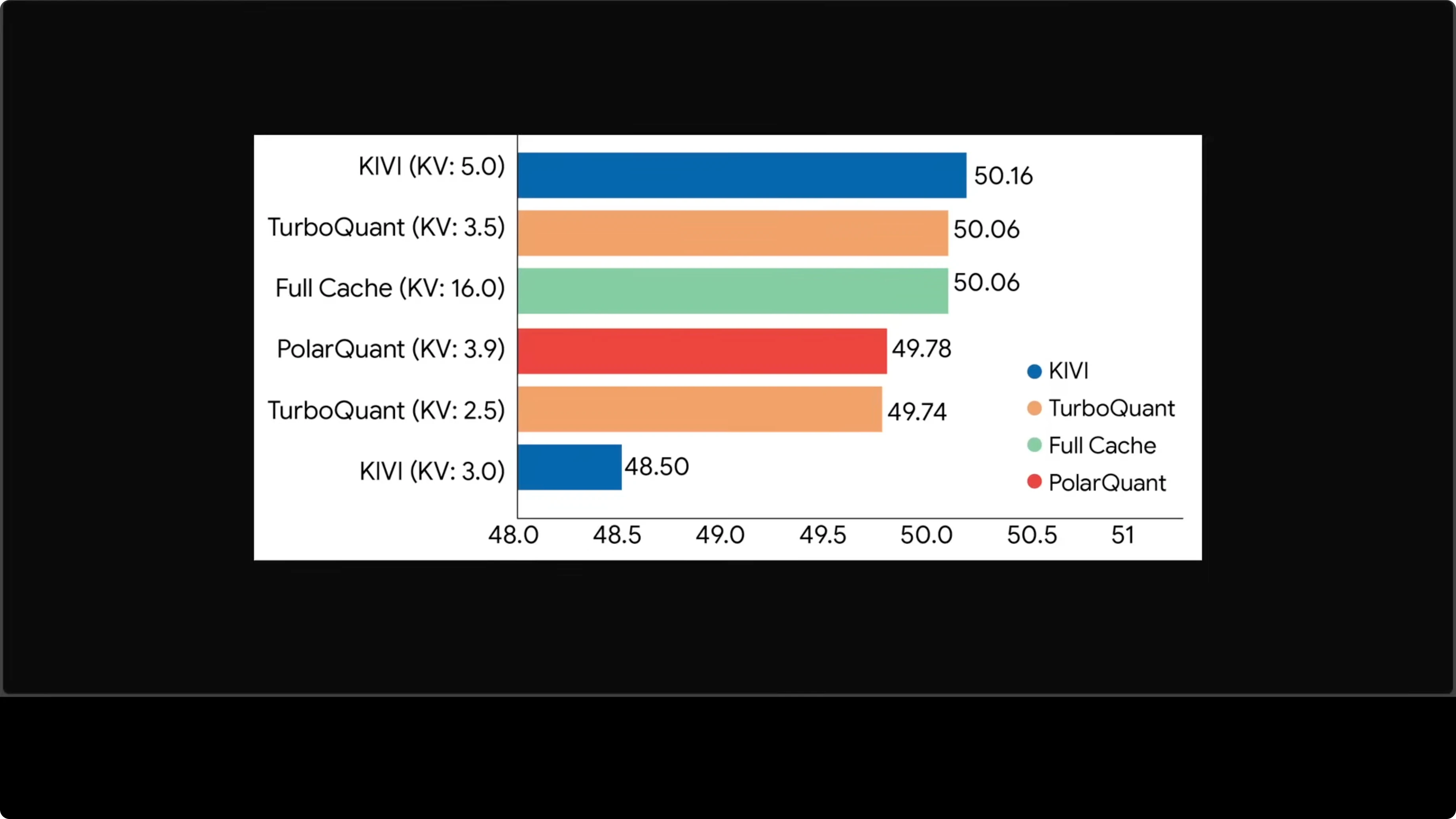 On real tasks like question answering, coding, and summarization, TurboQuant at roughly 3.5 bits matches a full cache at 16 bits. That is a strong result given the compression rate. The accuracy holds while memory drops.