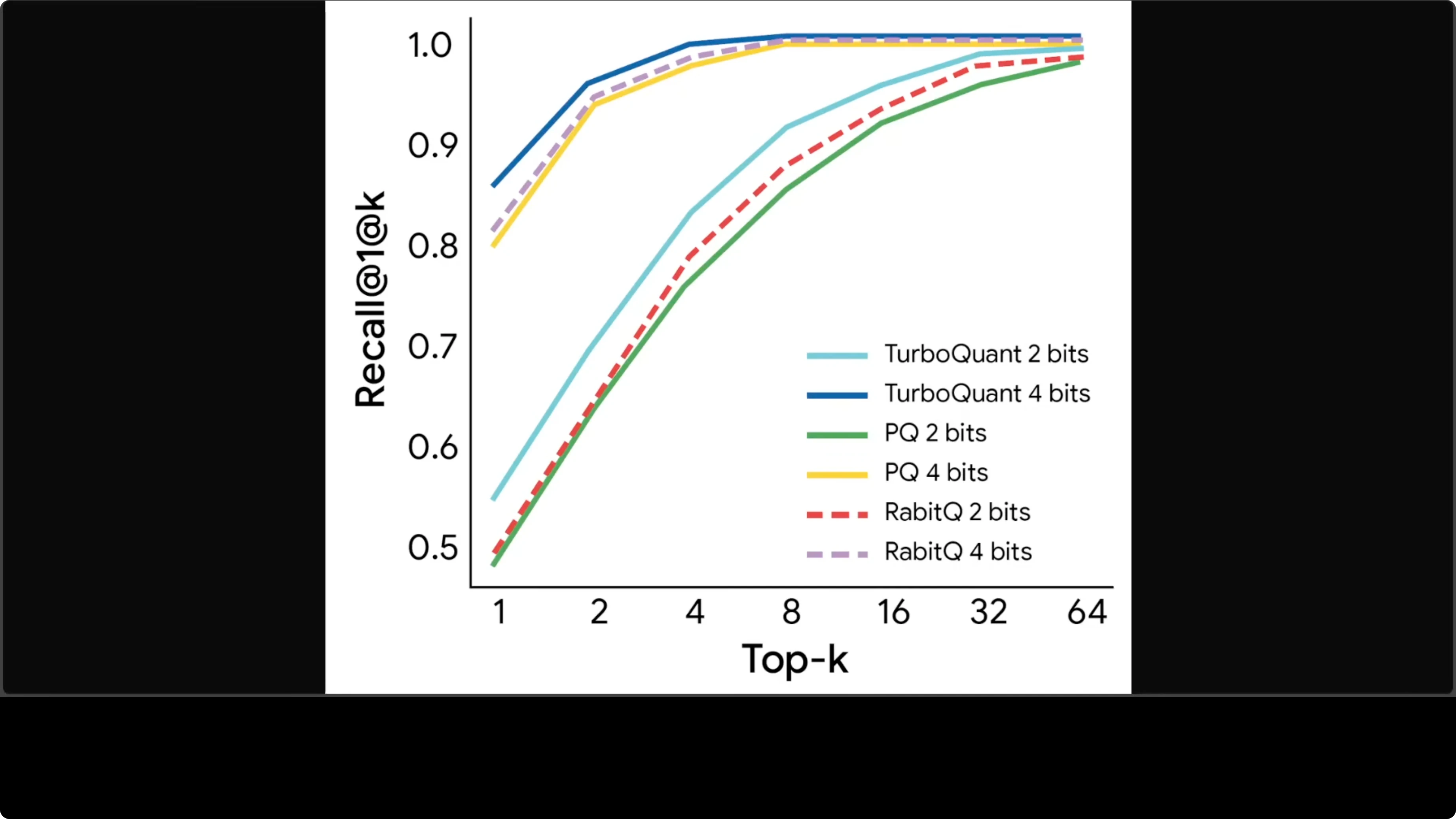 Vector search recall is also strong. The 4-bit line for TurboQuant sits above competitors at every value of K. Better compression and better recall without trade-offs is rare.