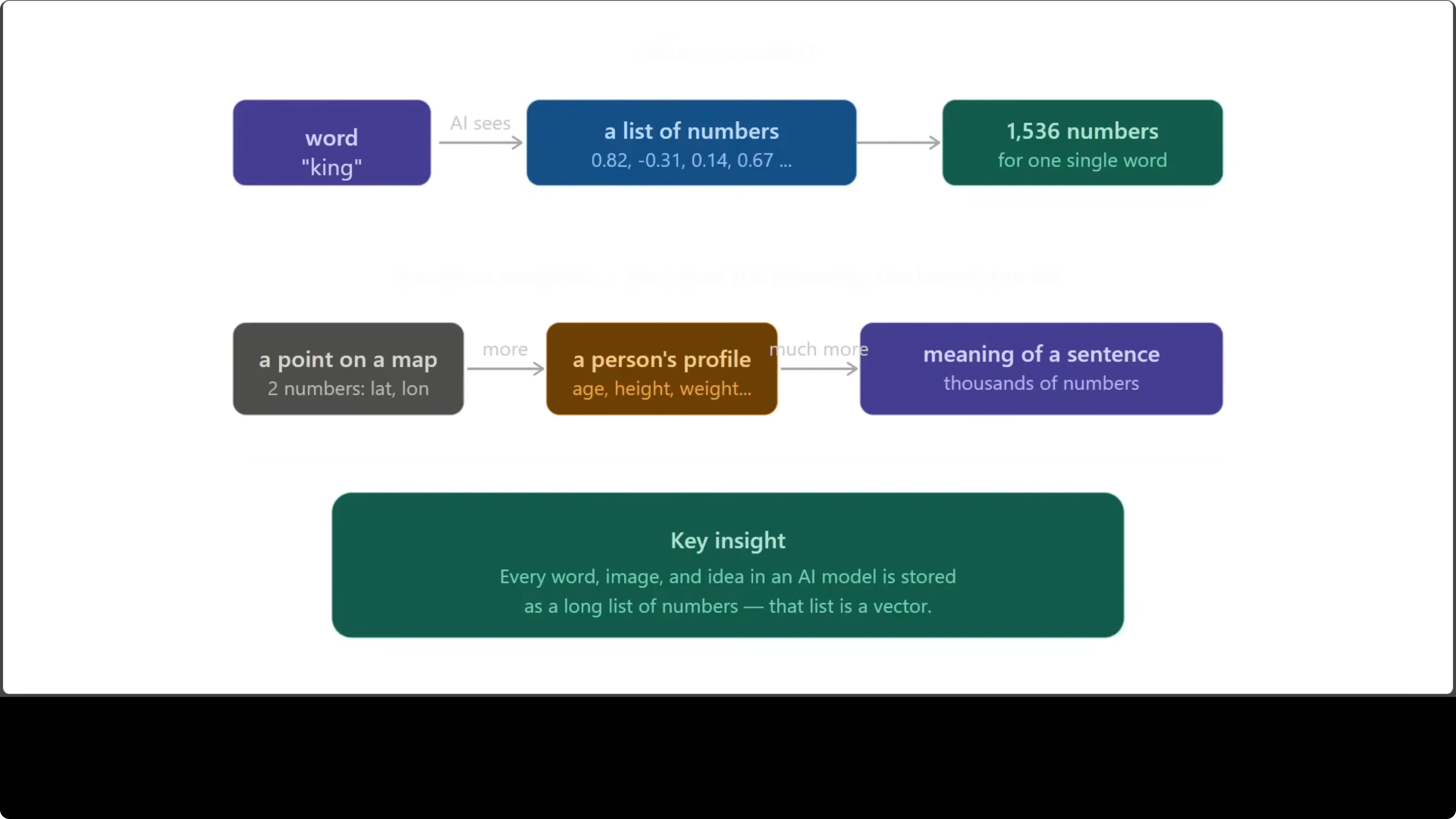 First, vectors. When an AI model reads the word king, it does not see letters. It sees a long list of numbers capturing meaning, context, and relationships to other words.