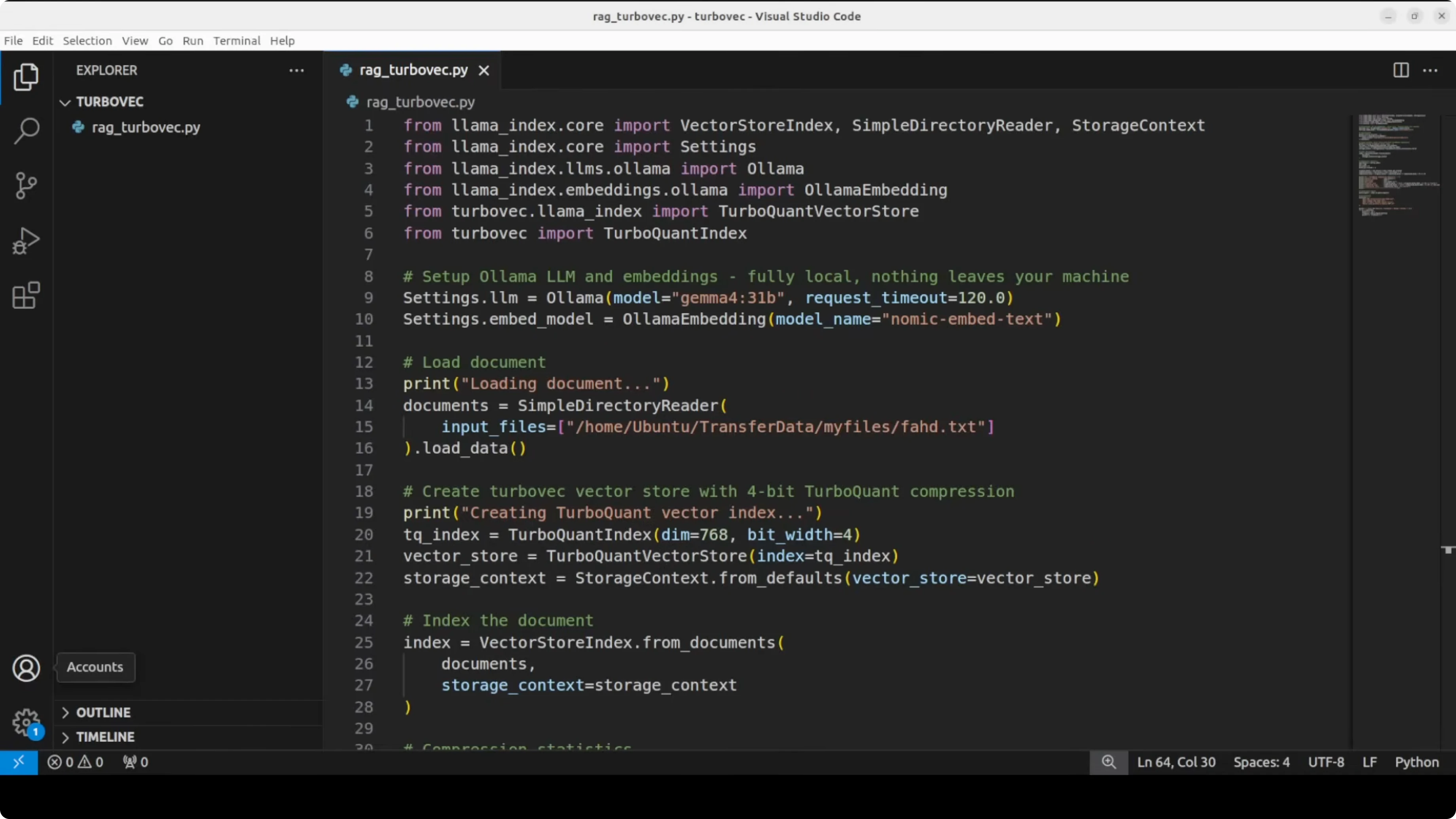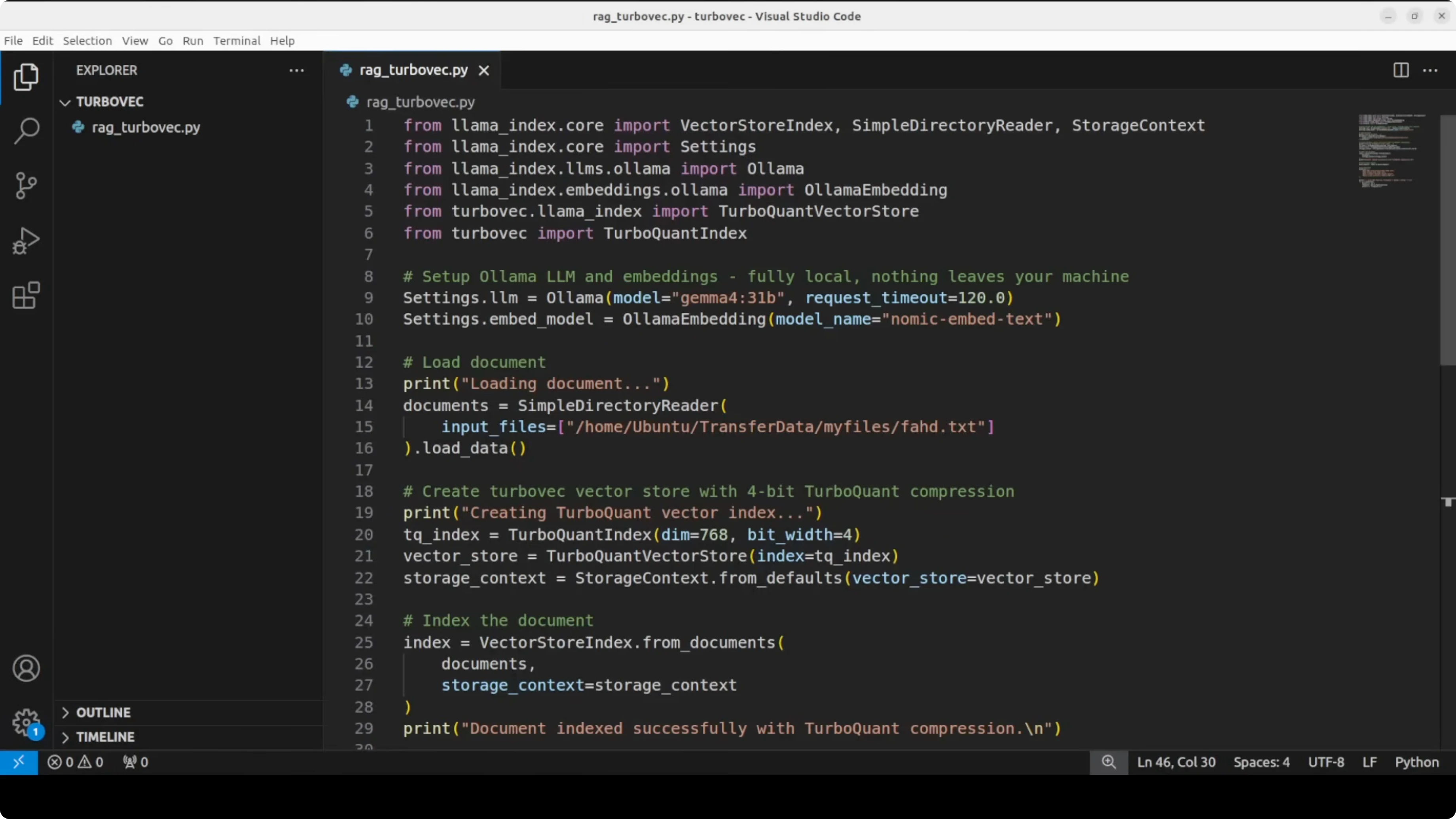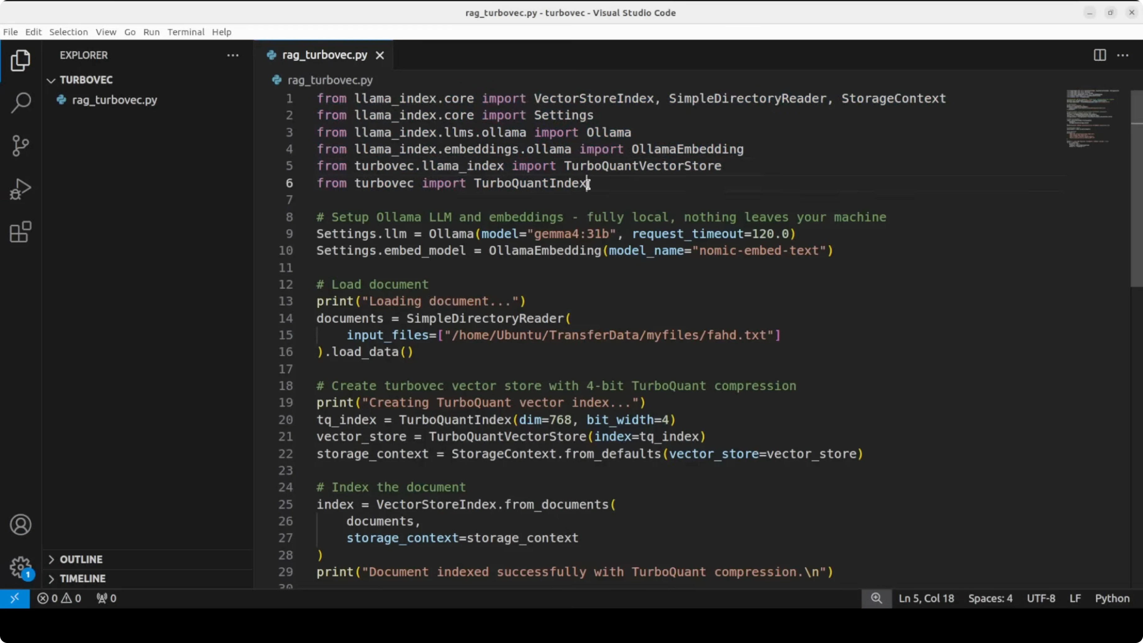 The following script shows the complete flow end to end. It loads a document, builds a compressed index with Turbovec, and answers a few questions using a local LLM via Ollama.