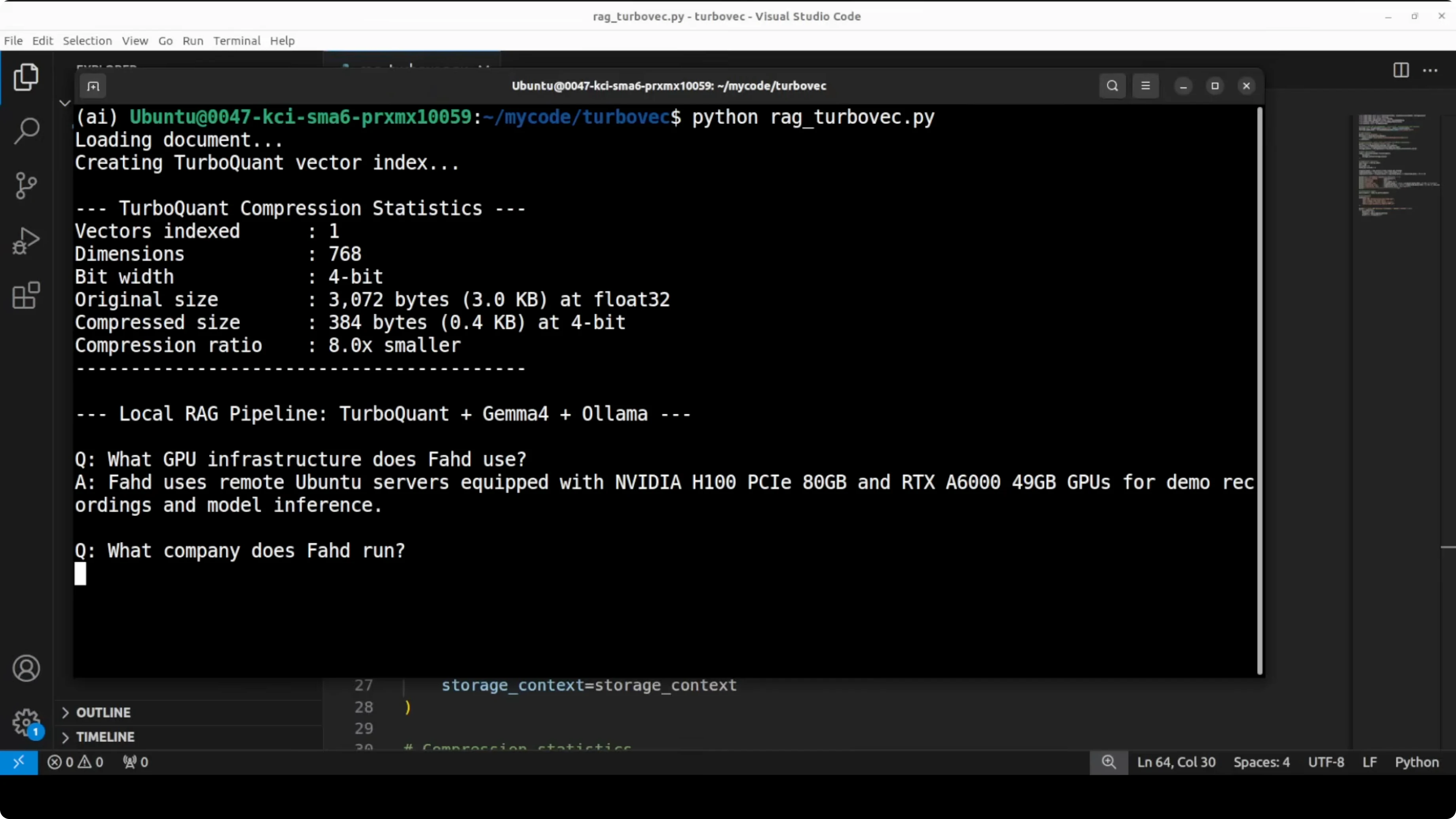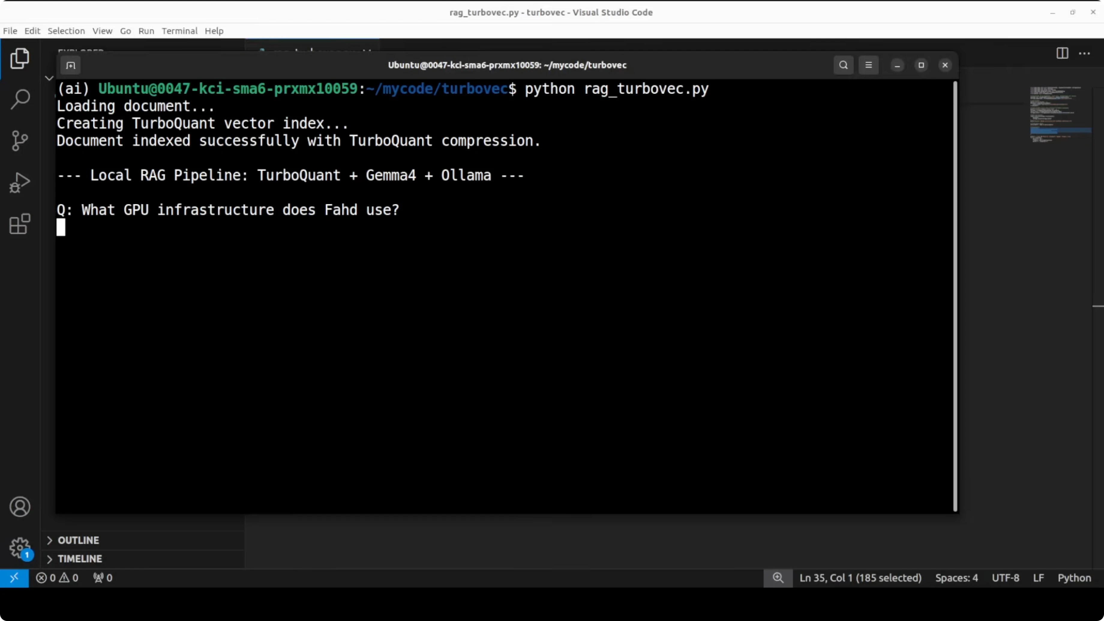 Everything runs locally with no external APIs. The pipeline loads a local text file, compresses its embeddings into a Turbovec index, connects to a local LLM through Ollama, and answers questions about the document. I also added a few personal question answer pairs that are only present in the file to verify locality.