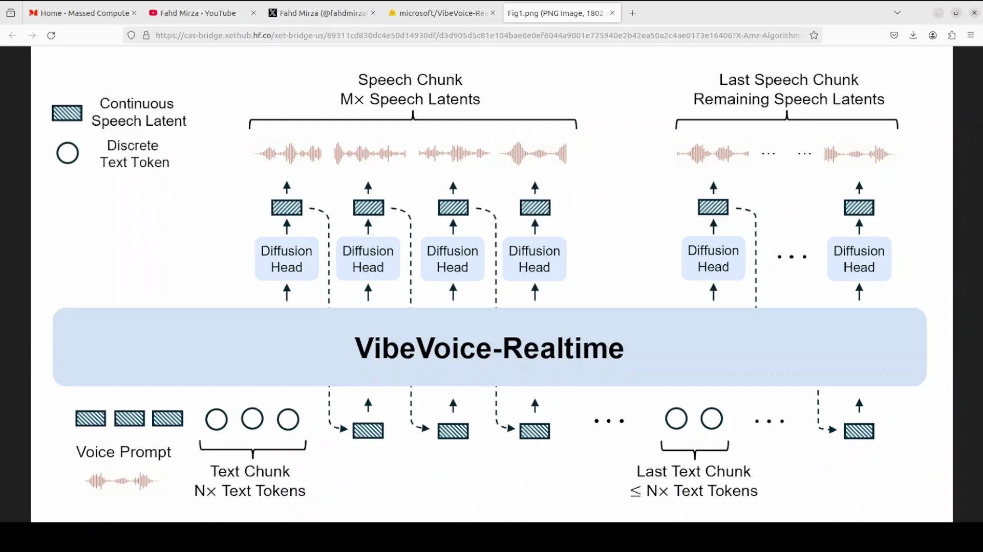 - In parallel, the model handles continuous speech latents, which are highly compressed representations of audio, generated by the acoustic tokenizer operating at a low 7.5 Hz frame rate.