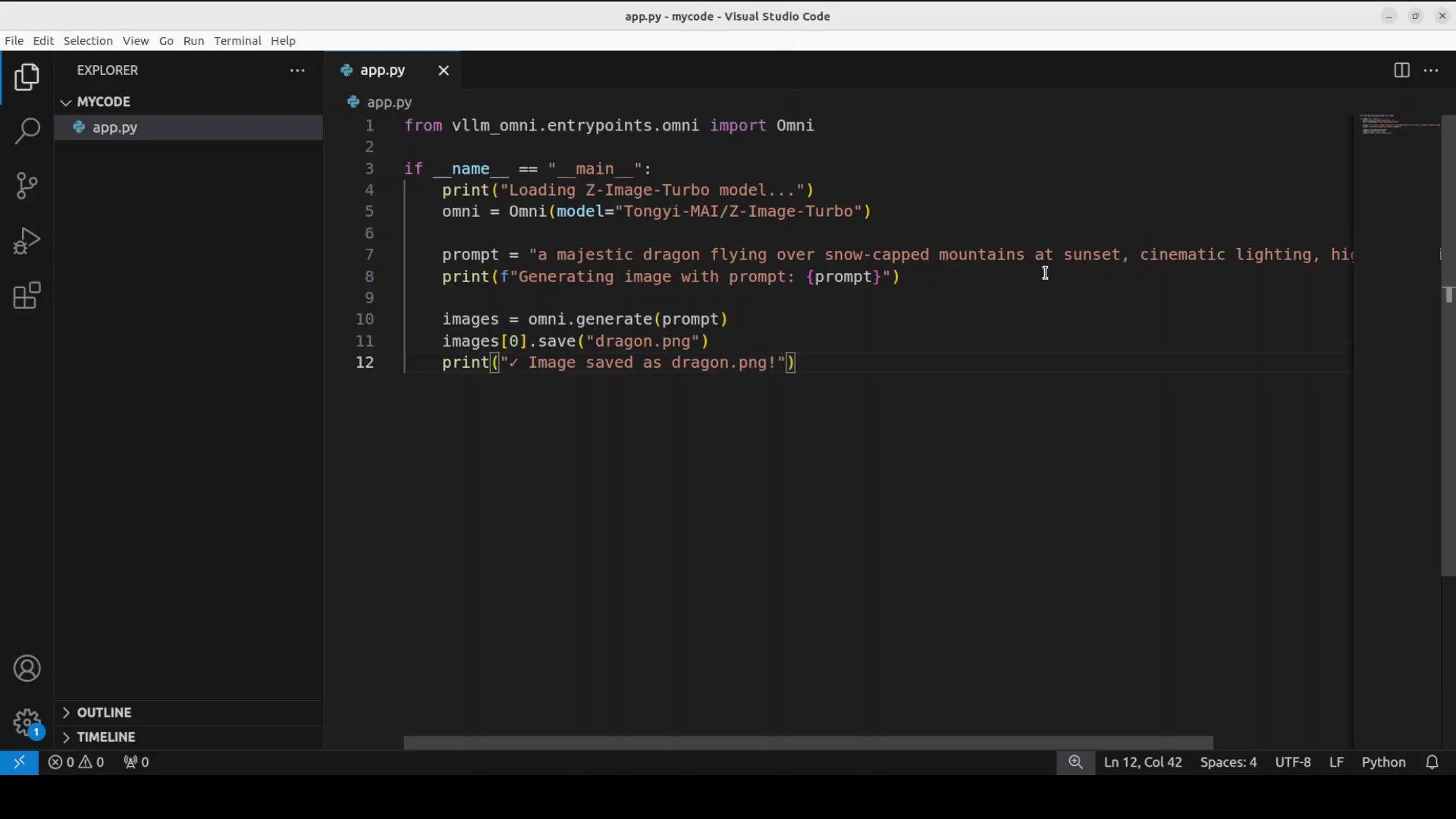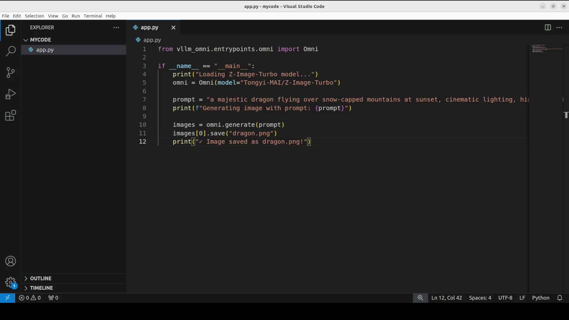 Run the offline script. The model is downloaded, then it generates the image defined in the code. I used the prompt a majestic dragon flying over snow capped mountain and it is saved on the local system.